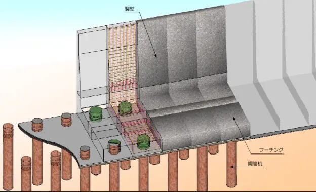 従来の巨大堤防は地下杭や支持基盤で構成されている基礎と堤防を支える支柱鋼管を内蔵させてコンクリート製の壁を形成しています。