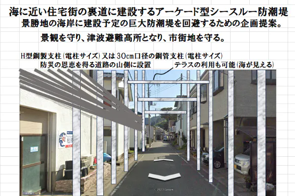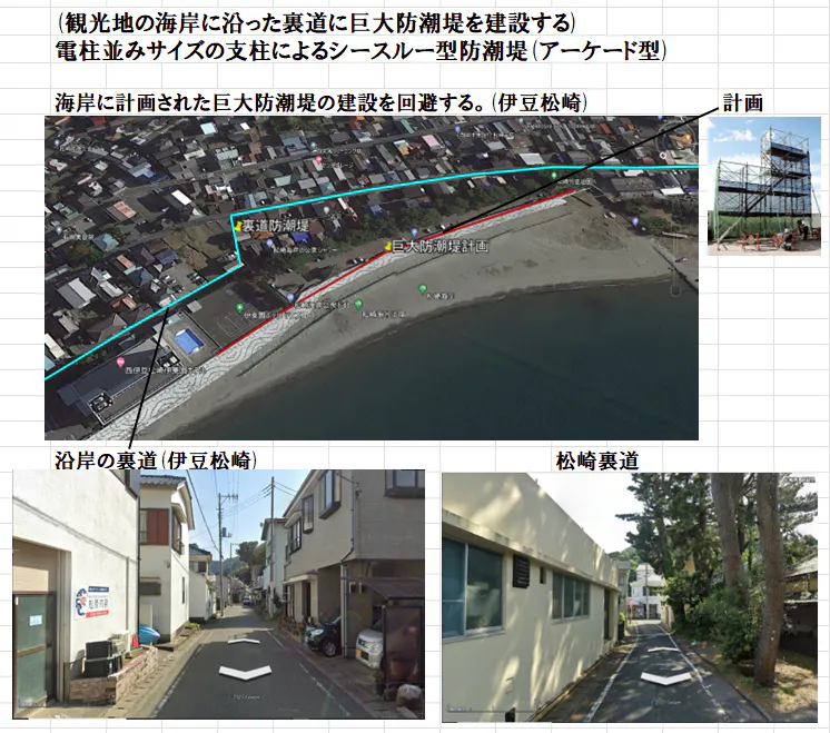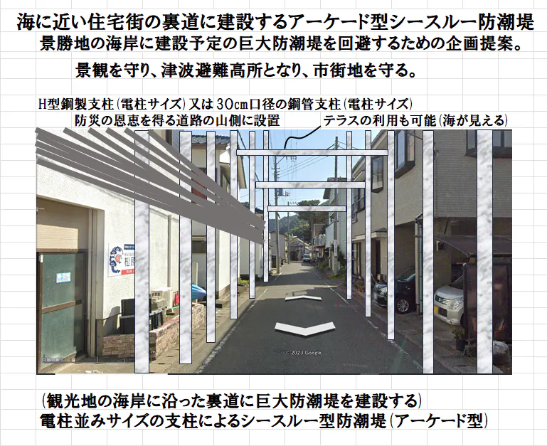 裏道に建設するシースルー型防潮堤によれば、貴重な景勝地を巨大堤防で破壊することなく、今までの景観を保持しつつ、巨大津波を防げる防潮堤を景勝地に建設することが可能です。