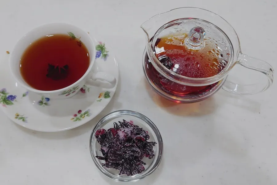 ②コップに乾燥させたローゼルの萼を入れ、熱湯を注ぎます。約8分ほど蒸らせば、「ローゼルティー」の完成です。