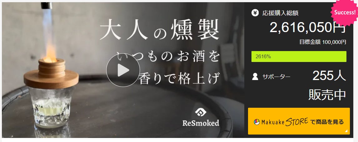 前回プロジェクトのグラスの上でお酒やおつまみを瞬間燻製で美味しくする、燻製キット「ReSmoked」では、応援支援額:261万円、サポーター数:255人と多数の方々より、ご支援いただきました!