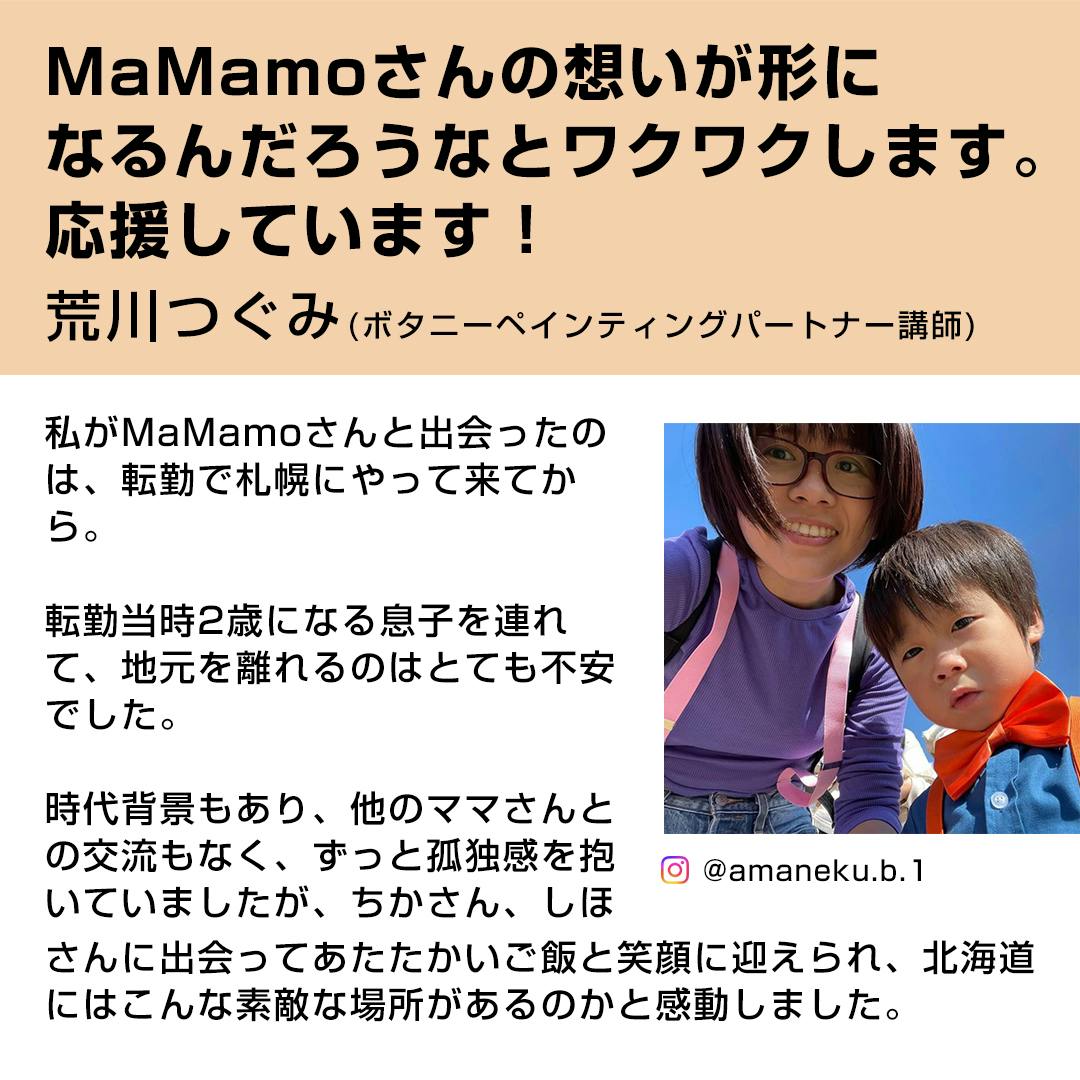 2024/03/01 19:18marie様 からの推薦メッセージをご紹介します!*********MaMamoの二人は、第一子の時からのママ友「ないなら2人のお店作ろう!」とふと話したことがきっかけて二人の挑戦はスタート。私は、腸活・食を通して梁田千香さんと出会い、その時にワクワクに満ち溢れた千香さんの話を聞きました。そして、常にどうしたら実現できるのか?マイナスな言葉は聞いたことはありません。ママが健康で笑顔でいることは、子ども・家族の笑顔や健康に繋がると思います。つい子ども優先になってしまう毎日からママ自身に目を向けられる、子育てしやすい町づくりとして、得意・不得意を共有し合い、お互いが協力し合える場所になると思います。応援しています!Instagramhttps://www.instagram.com/___m.s13_chou*********メッセージありがとうございました!札幌を子育てがしやすいまちにしたい。ママが我慢しないで当たり前のように 自分の人生を選択できるためにMaMamoは活動してまいります。想いを動画にしました!++++リターンを追加しました! ~おすすめリターンのご紹介です~・3月19日 よもぎ蒸し+ワンドリンク付き(10時 / 11時 / 12時 / 13時 / 14時 / 15時) 残り5枠・起業家ママ ご相談オンライン 3ヶ月 残り5名 お申込はこちら++++イベント情報◇ ボタニー×ディンプル ワークショップ(クラウドファンディング特別イベント)開催日:2024年3月29日(金) 10時00分~15時00分(予定)開催場所:MaMamo ※20家族限定費用:10,000円(この料金でご家族全員ご参加いただけます+おにぎりとMaMamo特製豚汁つき )お申込みはこちら もっと見る