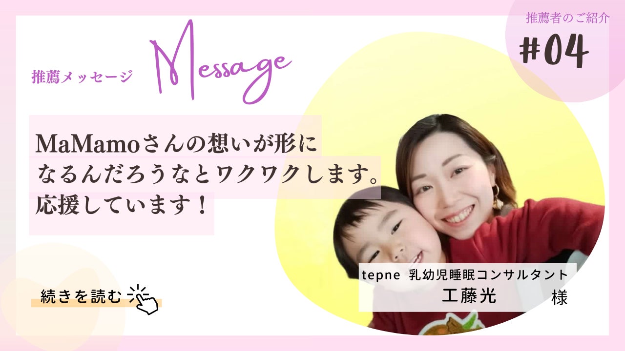 Kana様 からの推薦メッセージをご紹介します!*********千香さんとは、2021年10月に年賀状撮影会で出会いました。MaMamoがまだオープンする前で、撮影会のお知らせをInstagramで拝見し、真っ先に応募しました。夫が車椅子ユーザーなので、その相談もしたところ快く対応してくださいました。その後月日は流れ、イベントで再会を果たしました。私は自分でエステサロンを開業する前で、ママや子供のために孤育てを無くしたいという熱い想いを千香さんから感じ、私もそんなサロンを目指したいと思いました!今では、チカイーツを月契約していて、MaMamoの美味しいご飯を家族みんなで食べています♪仕事家事子育て介助でヘトヘトなので、夜ご飯にチカイーツがあると本当に助かります。しかも、栄養満点で美味しいです千香さんとは定期的に連絡をとっていて、身体に良いものなどの情報交換もしています。私にとって千香さんは、家族にとっても、なくてはならない大切な存在です。Instagramhttps://www.instagram.com/katy_extraction_sapporo*********メッセージありがとうございました!札幌を子育てがしやすいまちにしたい。ママが我慢しないで当たり前のように 自分の人生を選択できるためにMaMamoは活動してまいります。想いを動画にしました!++++リターンを追加しました! ~おすすめリターンのご紹介です~・3月19日 よもぎ蒸し+ワンドリンク付き(10時 / 11時 / 12時 / 13時 / 14時 / 15時) 残り5枠・起業家ママ ご相談オンライン 3ヶ月 残り5名 お申込はこちら++++イベント情報◇ ボタニー×ディンプル ワークショップ(クラウドファンディング特別イベント)開催日:2024年3月29日(金) 10時00分~15時00分(予定)開催場所:MaMamo ※20家族限定費用:10,000円(この料金でご家族全員ご参加いただけます+おにぎりとMaMamo特製豚汁つき )お申込みはこちら