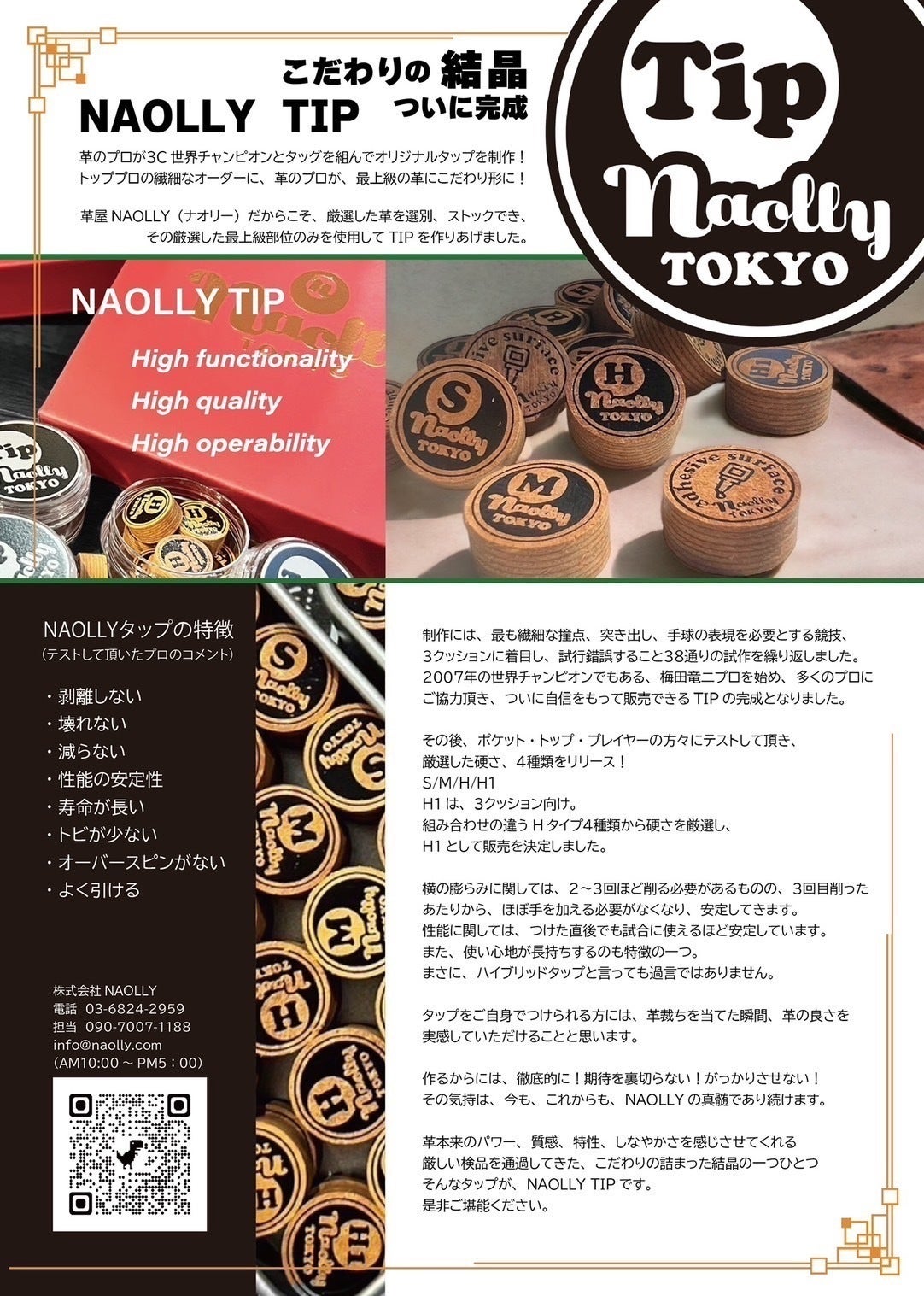タップ選びに悩んでいる時、NAOLLYタップの開発のアドバイザーに我々兄弟を選んでいただきました。我々のタップへのわがままを親身に聞いて下さり、タップの為に厳選した革の部位を使用しエッジの効いた今までに無い球離れの良さを実現。さらに良質な革だからこそ出し得るグリップ感。プレイヤーの感覚をロス無く再現出来る信頼性。その全てから放たれる卓越したスピン量。どの角度から見ても最高なタップを作成していただきました。長期に渡り悩んでいたタップ選びから解放され、タップの性能による助けがあり最高のパフォーマンスを実現出来ています。この感謝を結果のみならず違う型で恩返ししたい、さらに全世界のビリヤードプレイヤーにNAOLLYタップの素晴らしさを知ってもらいたいと思い、このプロジェクトを立ち上げました。