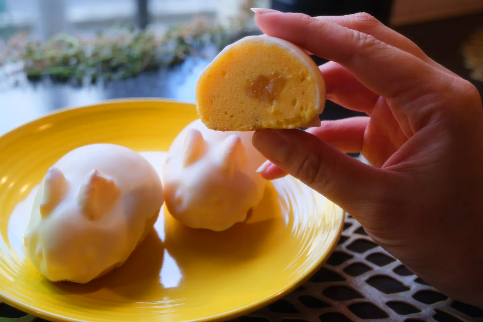 黄うさぎ【原材料名】国産卵、レモンチョコレート(植物油脂、脱脂粉乳、砂糖/乳化剤、香料、着色料(黄4))、国産米粉、国産発酵バター、砂糖、長崎産レモン、レモンピール(レモン,砂糖,洋酒,水飴/香料)、水あめ/トレハロース(一部に卵、乳成分、大豆を含む)【栄養成分表示:1個当たり】エネルギー380kcal,たんぱく質3.4g,脂肪21.5g,炭水化物42.7g,食塩相当量0.1g(推定値)【賞味期限】製造日より10日間 1個約80g