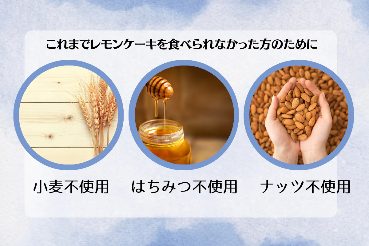 日本人の食品アレルギーで発症数が一番多いのは小麦です。当店はグルテンフリーのスイーツカフェということもあって、うさぎのレモンケーキは小麦不使用です。何度も試作を作りレシピを磨く中、アーモンドも省きました。出来る限りアレルゲンを省きたかったのですが、卵、乳成分、大豆は味の向上のために使用しています。アレルゲンを極力省くことで、より多くの方にこのレモンケーキを安心して食べていただくことができます。