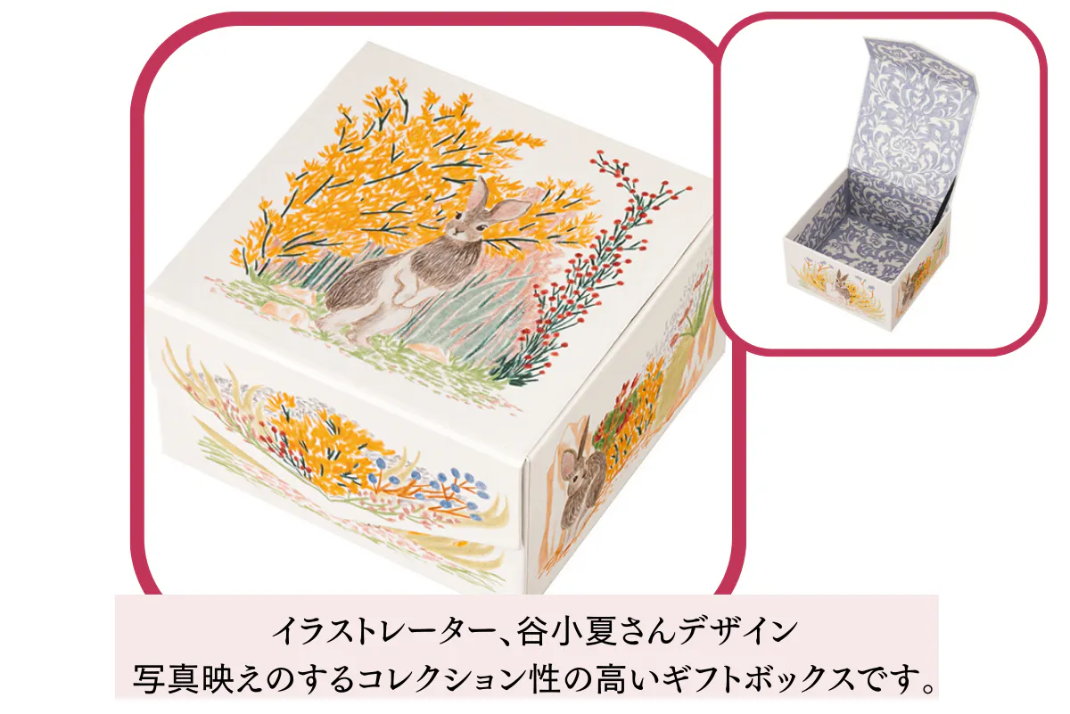 うさぎちゃんがお好きな方や小さいお子様へのプレゼントに喜ばれる可愛らしさ!ゴムリボンで可愛くあしらってお送りいたします。レモンケーキを食べた後の箱のリユースにワクワクしますよ!