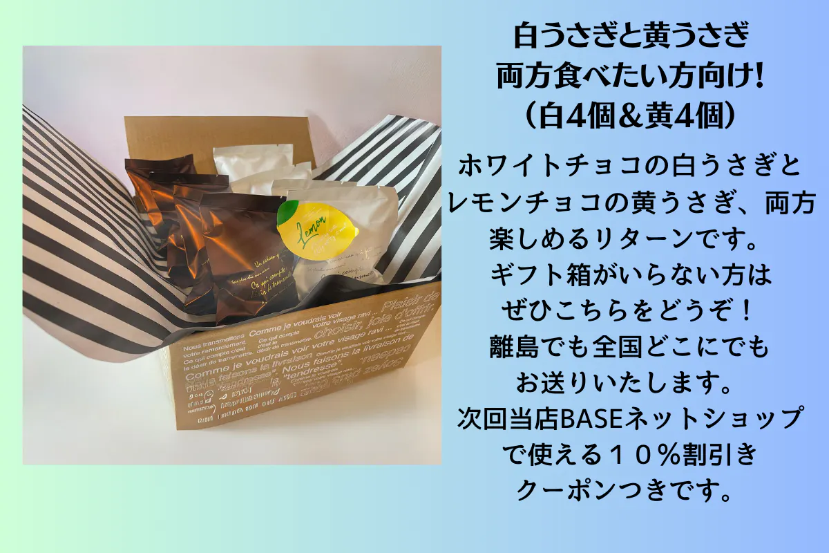 白いうさぎはホワイトチョコをまとった黄うさぎの兄弟です。ミルキーなやさしいホワイトチョコの甘さがレモンによく合います。食べ比べたい方におススメします。こちらは簡易包装で発送します。