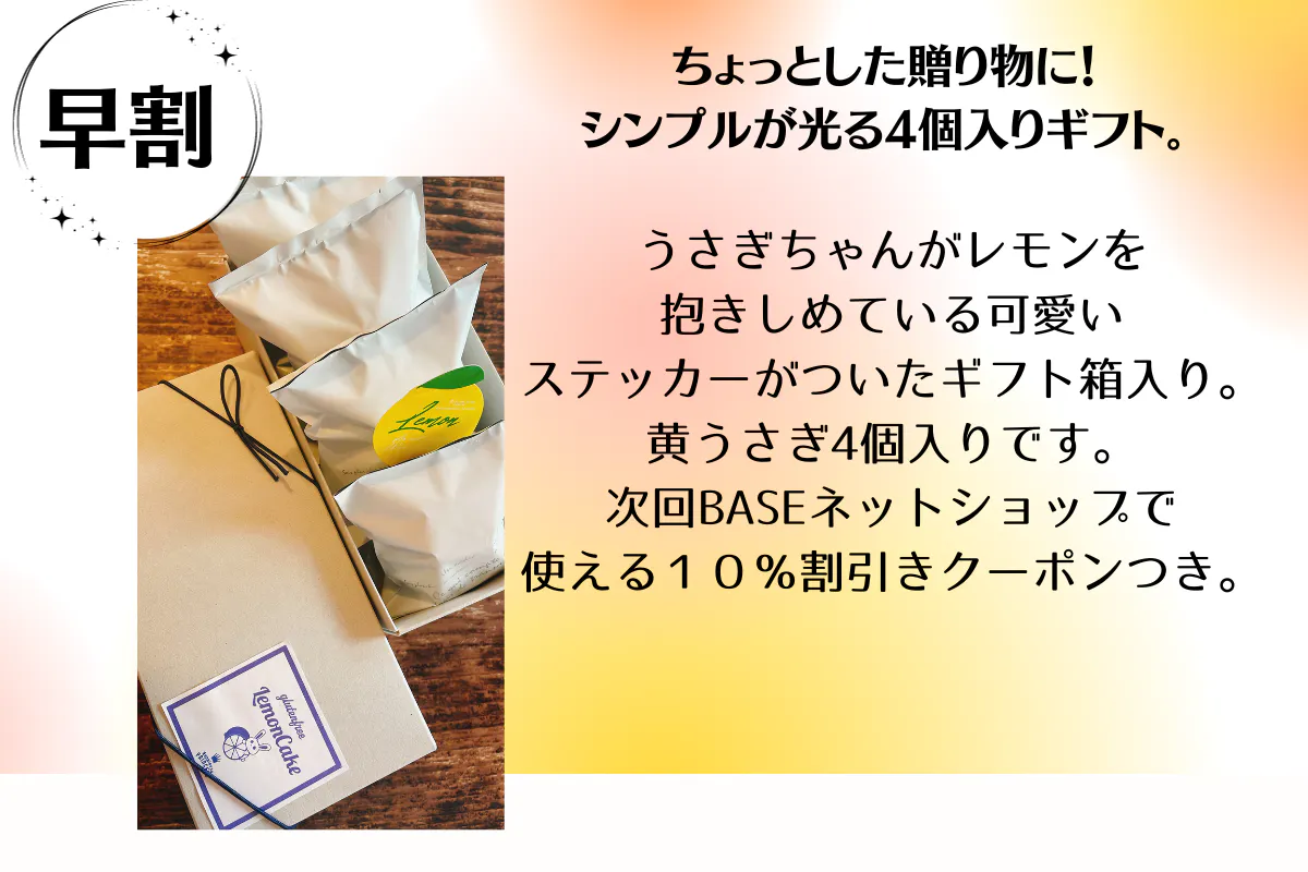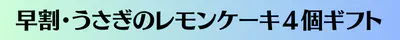 送料含む通常価格4,200円を早割10%引きで3,780円。うさぎのレモンケーキ(黄うさぎ)6個入りです。