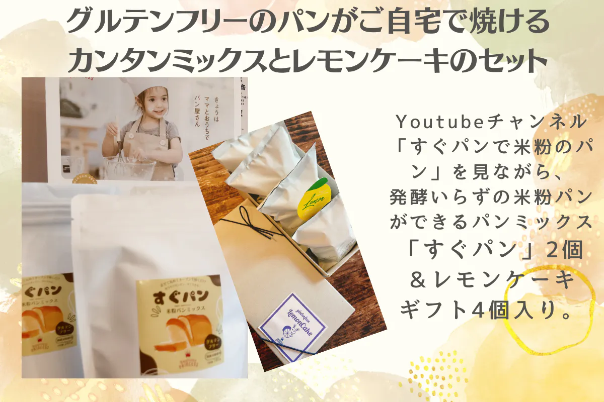 前回のクラウドファンディングでたくさんの方に支持頂いた国産米粉のパンミックス「すぐパン」とギフト箱4個入りうさぎのレモンケーキです。すぐパンは作り出して60分以内に米粉のパンやスイーツができてしまうパンミックスです。現在Youtubeチャンネル「すぐパンで米粉のパン」にレシピ動画を11本アップしています。なんとマヨネーズや牛乳(豆乳)で米粉のパンができちゃうレシピもあります。冬休みや寒いおこもりシーズンに自宅で思い立ったらすぐできる「すぐパン」をぜひ試してみてくださいね。一緒にギフト箱に黄うさぎ4個が入ったレモンケーキも同封いたします。当店のBASEネットショップで次回使える10%割り引きクーポンつき。送料含む5,200円。