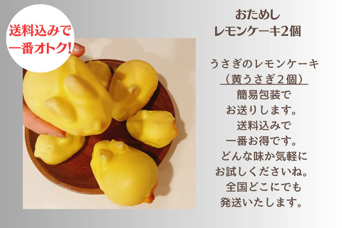 25個限定、簡易包装(送料込み)黄うさぎレモンケーキ2個入りのお試し価格です。全国どこにでもお送りします。