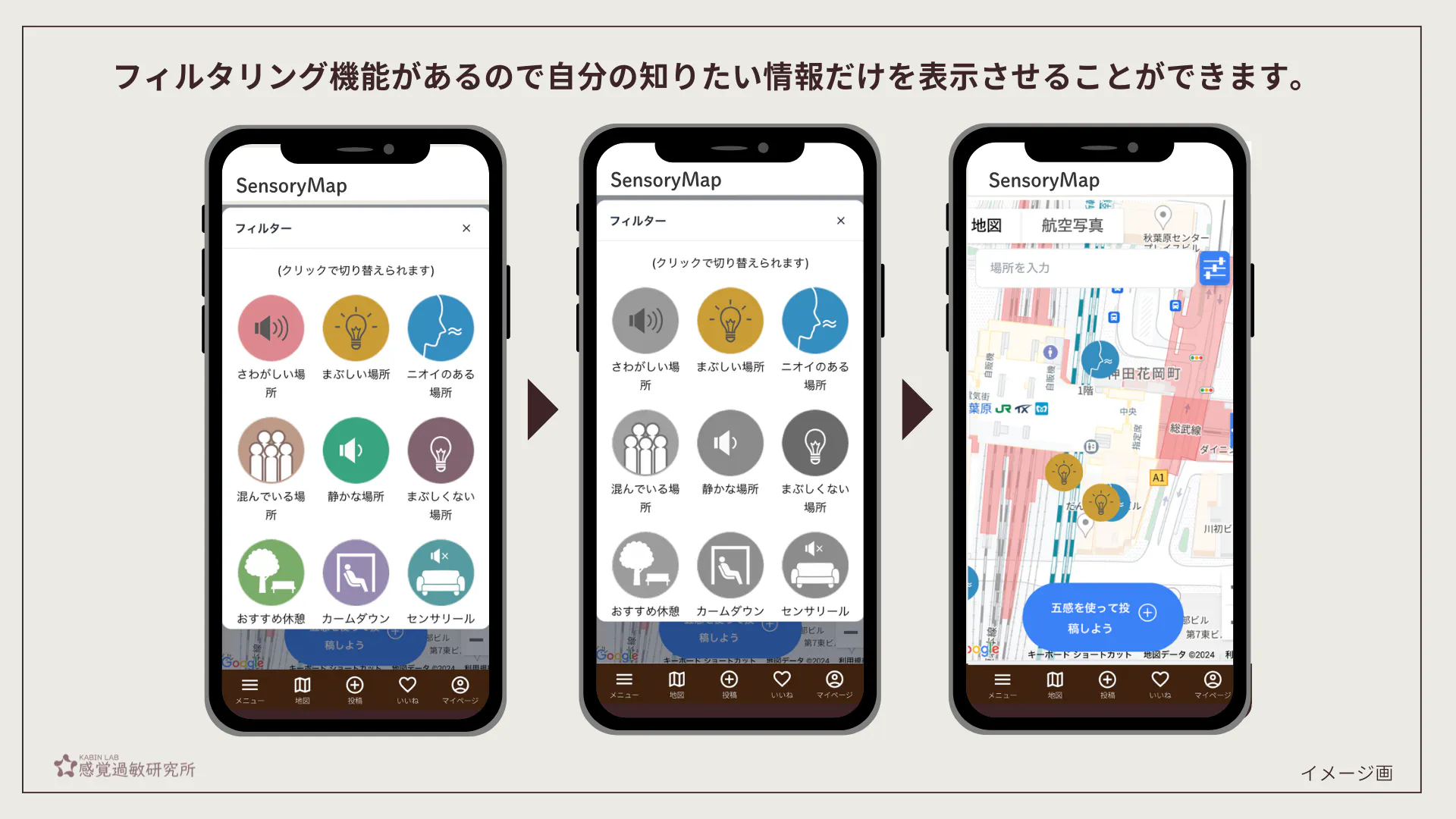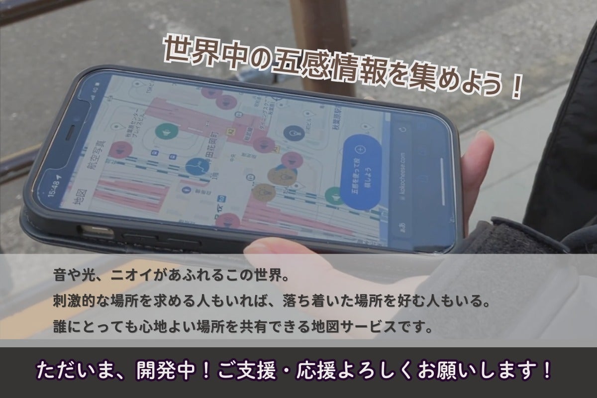 今回、私たちは、ウェブ上の広域マップに「さわがしい場所」「まぶしい場所」「ニオイのある場所」といった刺激のある場所や、「静かな場所」「カームダウンスペース」といった落ち着ける場所の情報を、ユーザーが口コミや評価を通して情報を共有できるマップの開発を進めています。