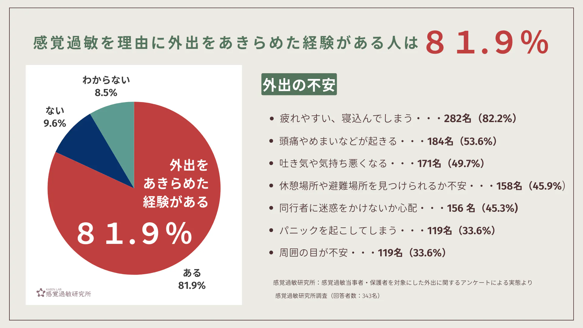 私たち感覚過敏研究所が行ったアンケートでは、81.9%の方が『感覚過敏を理由に外出をあきらめたことがある』と答えました。