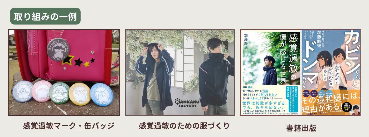 具体的には、感覚過敏の困りごとを可視化する「感覚過敏マーク」の作成、感覚過敏の人のためのアパレルブランド展開、カームダウンスペースの普及活動、講演や出版などを通して啓発活動を行っています。