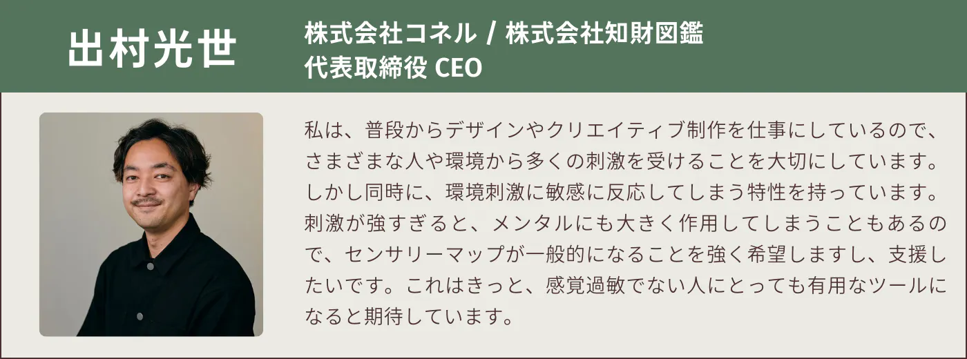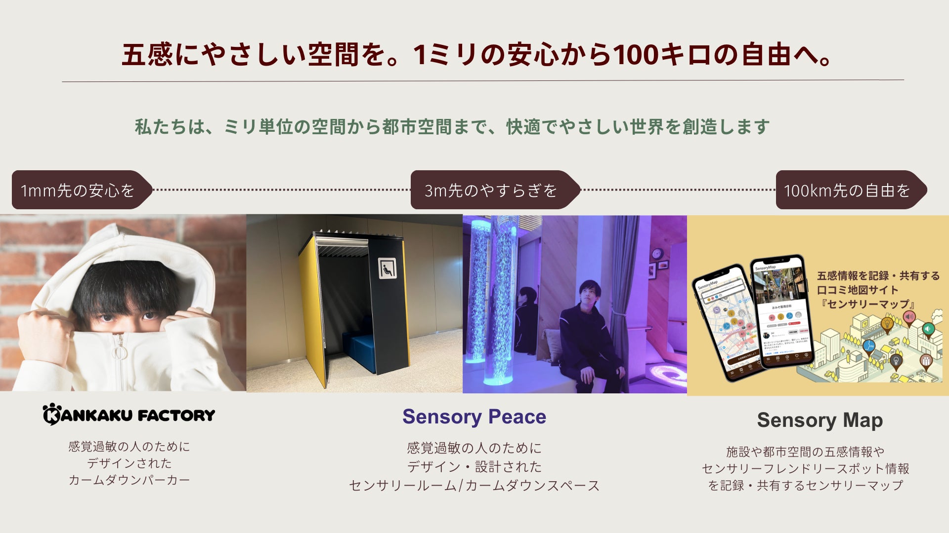現在、特に力を入れている取り組みが「五感にやさしい空間」づくりです。『1ミリの安心から100キロの自由へ』というコンセプトのもと、ミリ単位の服という小さな空間から、メートル単位の部屋、さらにキロ単位の都市空間まで、さまざまなスケールで「やさしい空間」を実現するための活動を行っています。今回のクラウドファンディングで挑戦するセンサリーマップも、この「五感にやさしい空間創造」の取り組みの一環です。