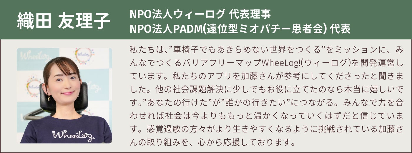 感覚過敏研究所の加藤路瑛(かとうじえい)と申します。感覚過敏の課題解決に取り組んでいます。この度、五感にやさしい社会モデルの構築を目指して、五感情報を記録・共有できるウェブ版センサリーマップのプロジェクトを立ち上げます。多くの方に「センサリーマップ」を知っていただき、その活動をご支援いただきたく、クラウドファンディングに挑戦します。