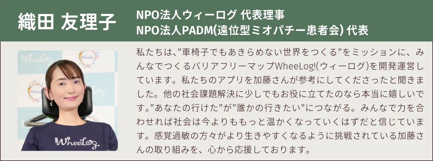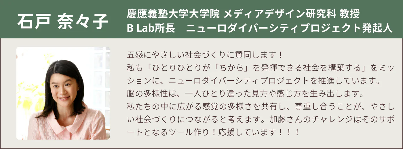 バリアフリーという言葉は社会に浸透しつつありますが、さまざまな病気や障害の方のアクセシビリティが少しずつ向上している一方で、センサリーアクセシビリティという考え方は、まだ日本ではほとんど知られていません。私たちの取り組みが第一歩になると思っています。これまで外出をあきらめていた方々が、外に出て買い物をしたり、レジャーを楽しんだり、人と会うことができるような社会を目指しています。