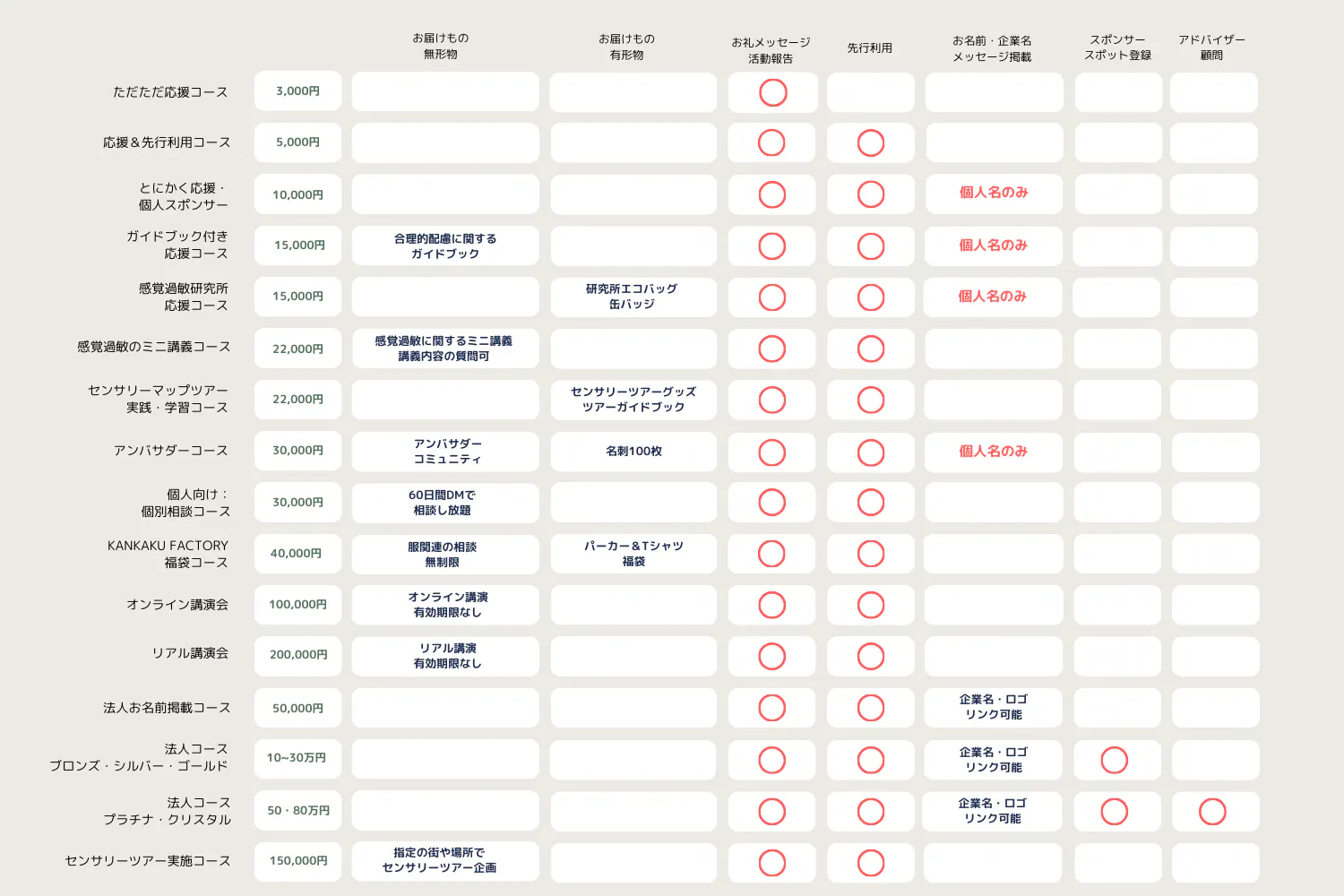 また、「このリターンがあれば支援したい」という内容がございましたら、お気軽にリクエストください。ご連絡は、CAMPFIREのメッセージまたは、感覚過敏研究所のお問い合わせフォームからお願いします。