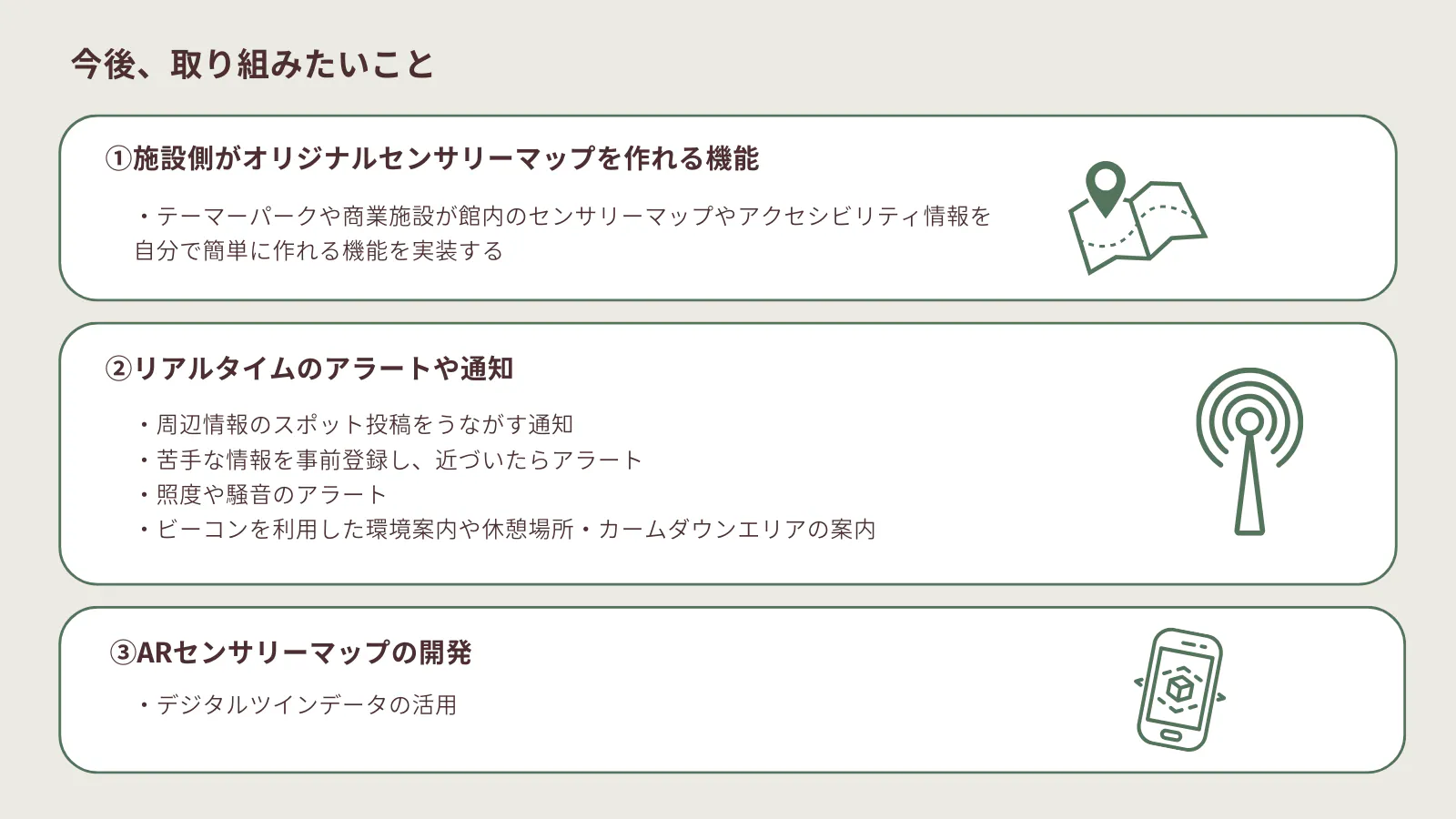 このセンサリーマップをベースに、各施設でオリジナルセンサリーマップを作れる機能を実装したり、スポット情報のアラートやお知らせを通知できる機能を実装していく計画です。