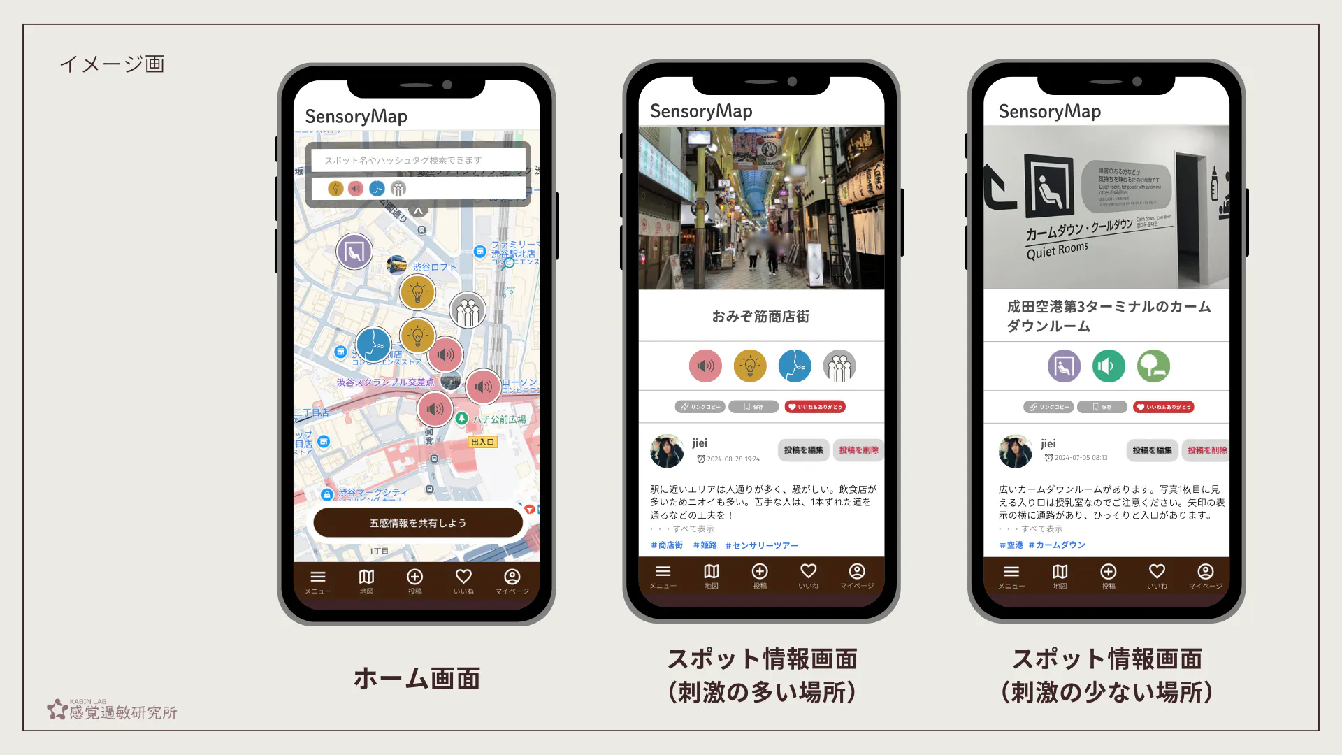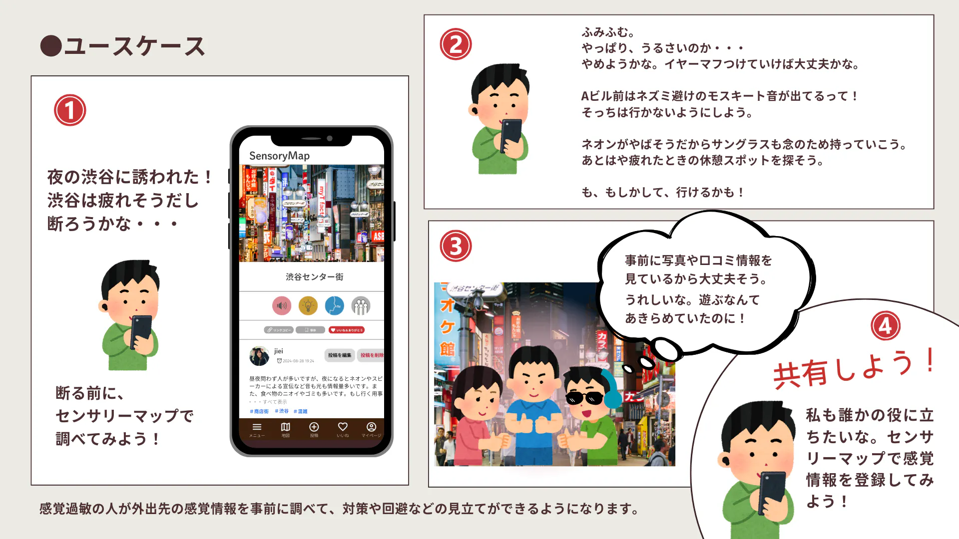 センサリーマップは、目に見えず困りごとが可視化されずに置き去りにされてきた、感覚過敏の人の外出や移動を支援するウェブアプリケーションです。