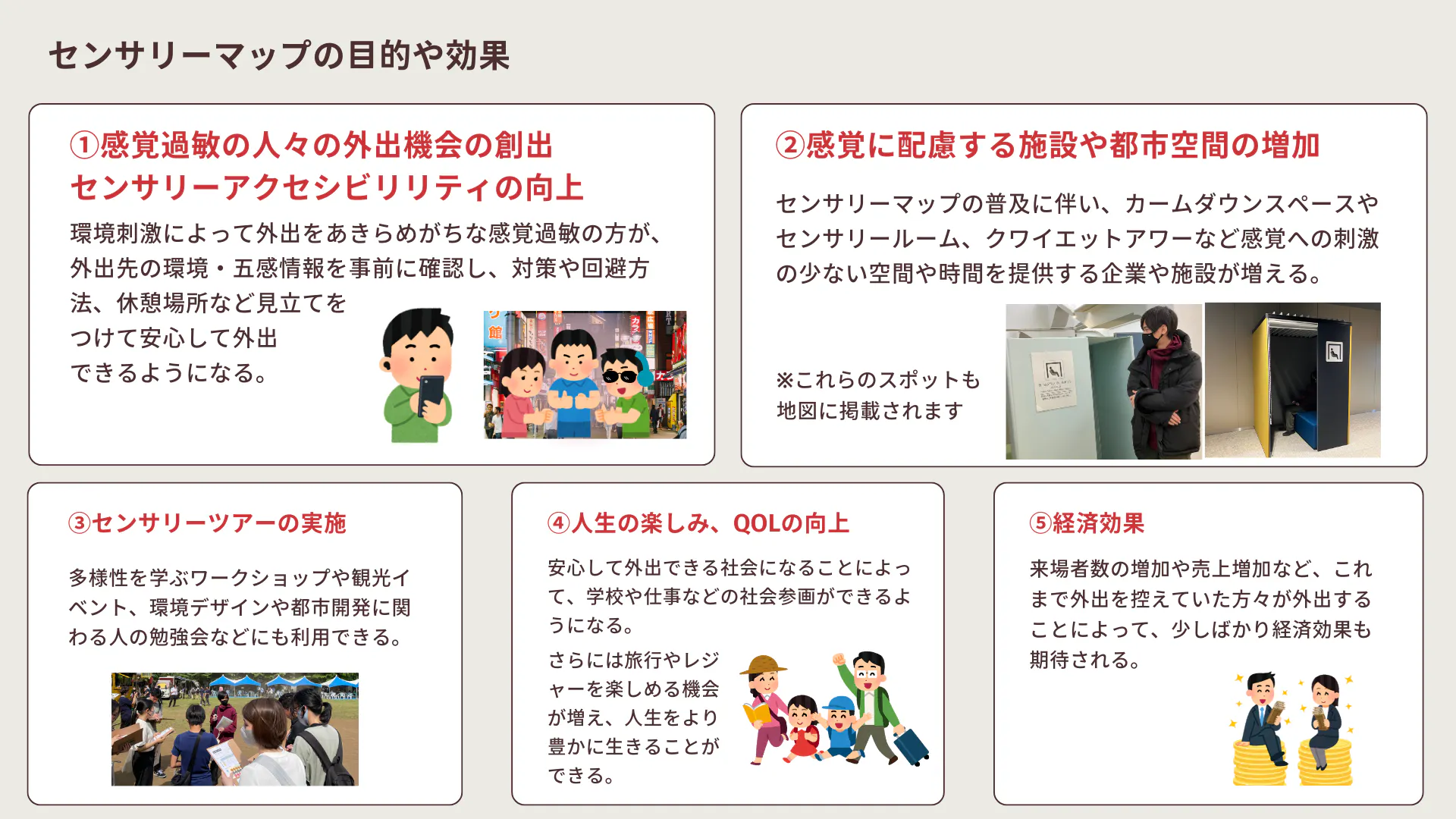 センサリーマップの効果は、感覚過敏の方々の外出をサポートするだけではありません。センサリーマップが普及することで、地図上に表示されるカームダウンスペースや、感覚にやさしいスポット、サービス、イベントが増えることを期待しています。また、この情報を都市開発や空間デザインに活用してもらうことで、より多くの人々にやさしい環境が整うことを目指しています。