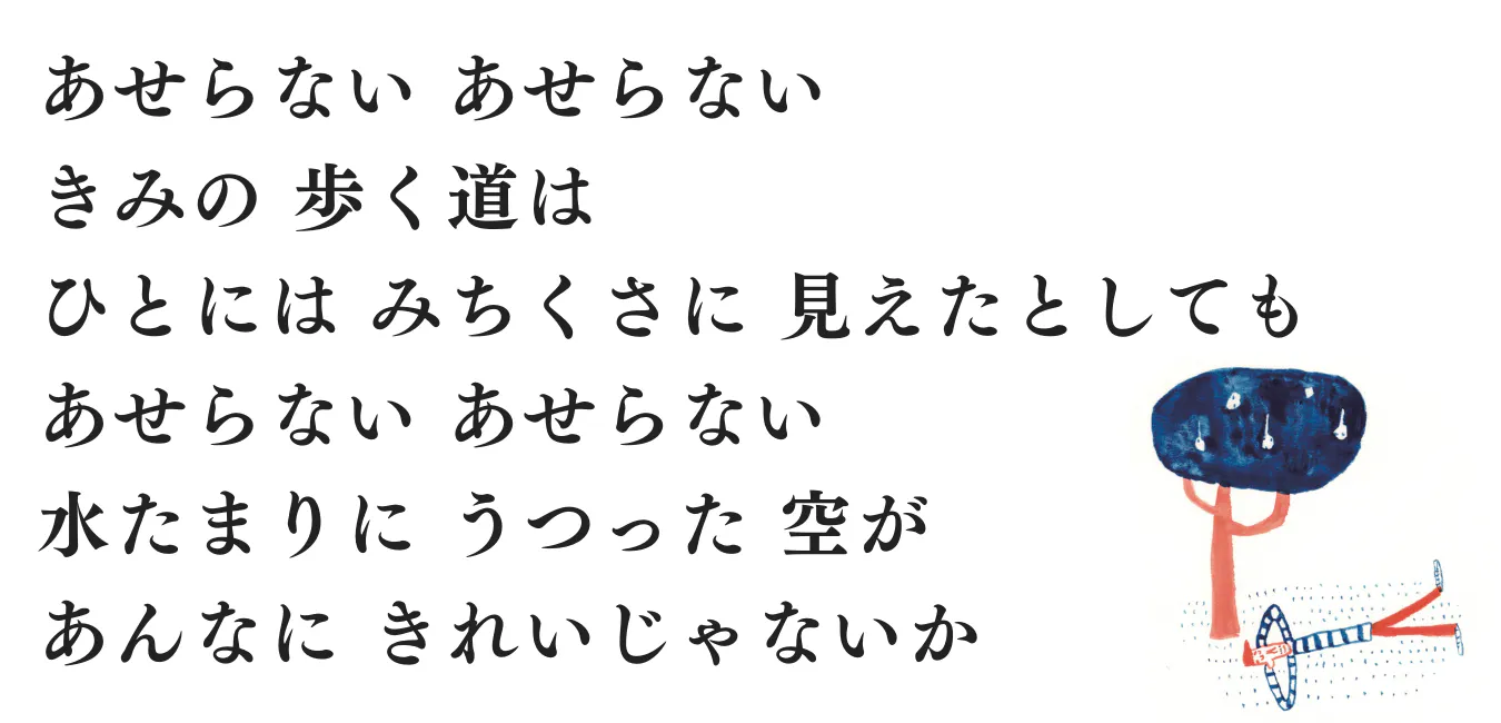 視覚的な表現をともなうことによって、よりイメージ豊かに歌が伝わっていくと感じられ、新しい試みをしてみたくなりました。そこで、アルバム『いきているそれだけで』のイラストを描いてくれたすがわらけいこさんに依頼して、新しく絵本の形で「みちくさ」を表現してもらうことにしました。詩の絵本、歌の絵本というスタイルで、CDとはまた違った作品にしたいと思っています。音声データやCDとは違う一冊の本は、手にとる、横に置いて大事にする、飾っていつも目にするなどと、みなさんの心に寄り添ったものになるのではないかと思います。