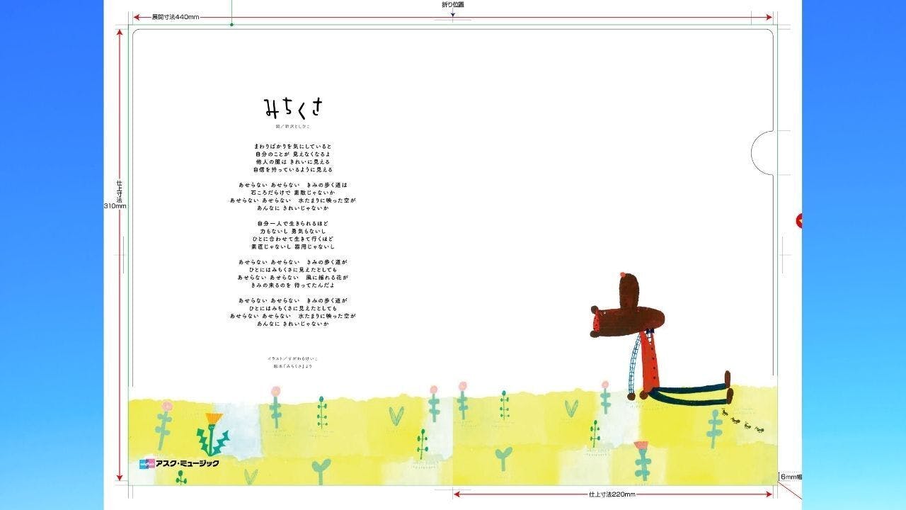 クリアファイルの表面は絵本「みちくさ」の表紙、裏面には歌詞がデザインされています。機能的なクリアファイルになるように、表面のイラスト以外のスペースは透明にしました。