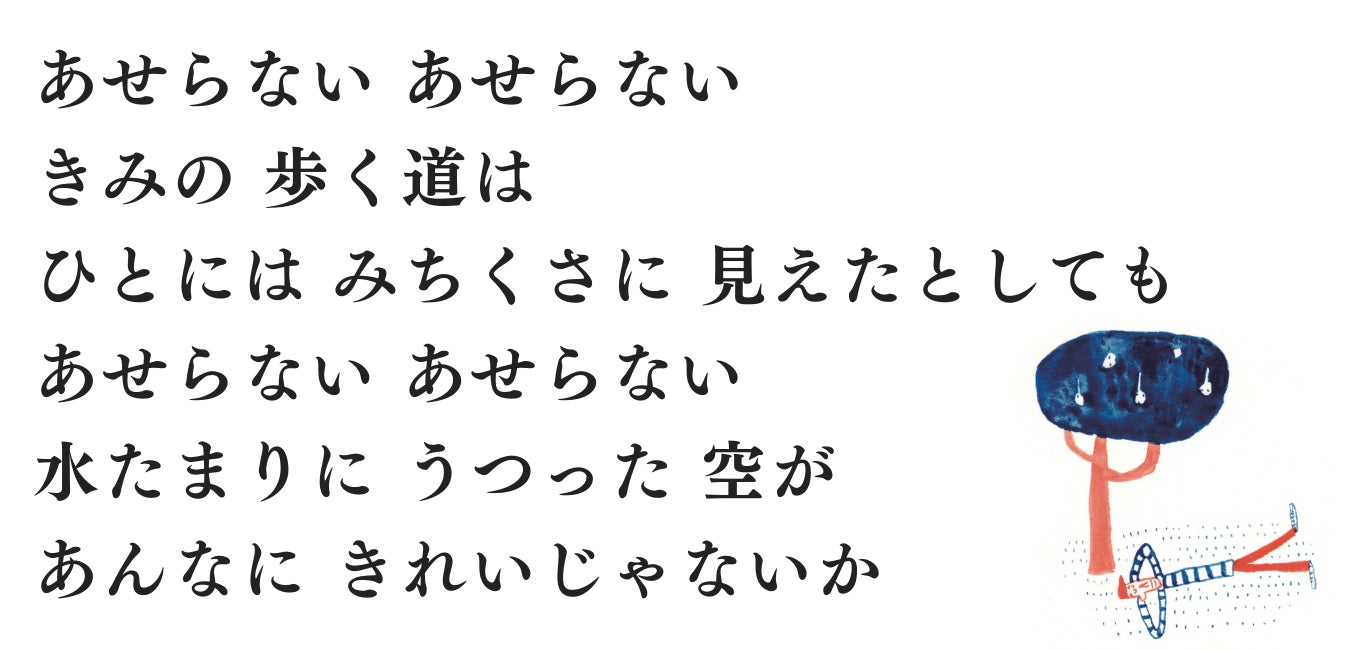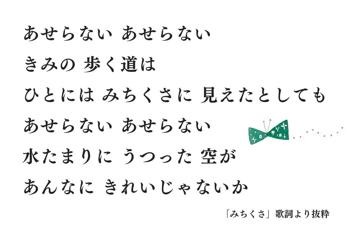 視覚的な表現をともなうことによって、よりイメージ豊かに歌が伝わっていくと感じられ、新しい試みをしてみたくなりました。そこで、アルバム『いきているそれだけで』のイラストを描いてくれたすがわらけいこさんに依頼して、新しく絵本の形で「みちくさ」を表現してもらうことにしました。詩の絵本、歌の絵本というスタイルで、CDとはまた違った作品にしたいと思っています。音声データやCDとは違う一冊の本は、手にとる、横に置いて大事にする、飾っていつも目にするなどと、みなさんの心に寄り添ったものになるのではないかと思います。
