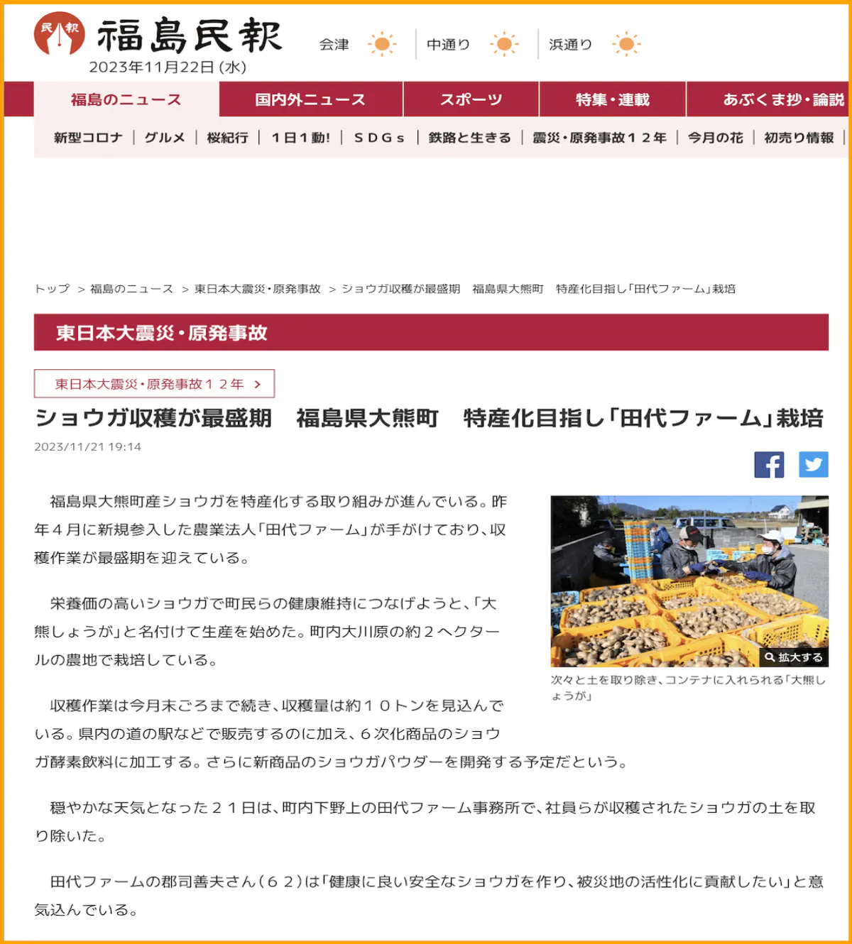 田代ファーム(パートナー企業)が福島民報でご紹介いただきました!