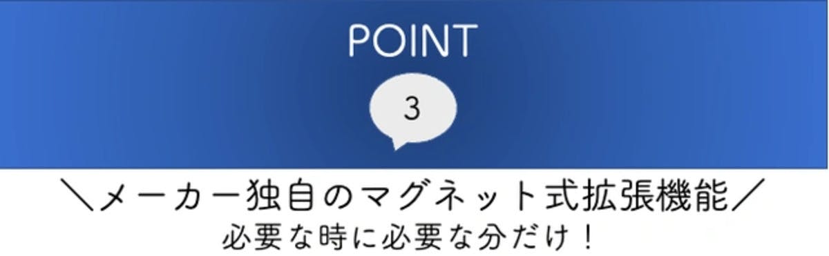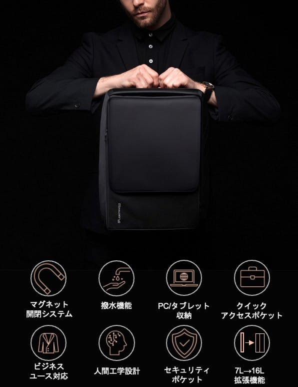 また、荷物が多い日でもその見た目を損なわない工夫が施されています。通常の拡張型バックパックと異なり、マグネット式で段階的に必要な分だけ拡張していくため、無駄にだぶついた印象を与えることもありません拡張してもスタイリッシュな見た目を保ち続けるために、実に2年もの試行錯誤を重ね、このデザインが完成いたしました。収納部の開閉にもメーカーの独自機能を搭載マグネット式開閉機能は、都度バックルでの開け閉めは不要。開閉もスマートにノーストレスで!