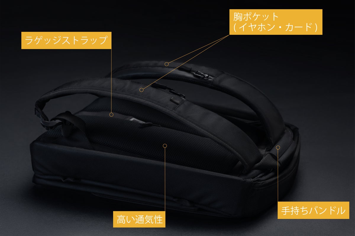 様々なシーンでの持ち運びを叶えるためのハンドルやスーツケース利用を想定したラゲッジストラップももちろん備えています!