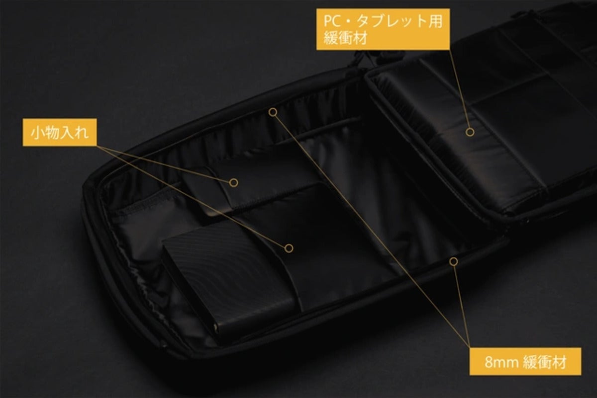通常よりも厚い緩衝材を使用したことで、PCやタブレットなど、ビジネスアイテムにも完全対応し、壊れにくい持ち運びが可能に。