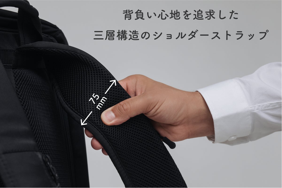 3層構造のショルダーパッドは、通気性が高く重い荷物を背負った時にも疲れにくい形状を実現。