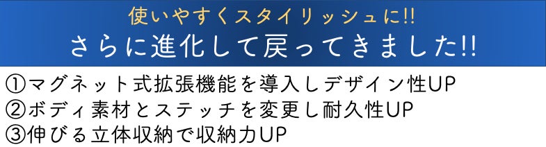 メーカー独自のマグネットを用いた、開閉システムや段階式拡張システムなど、ユニークで痒い所に手の届く使い心地が叶います。