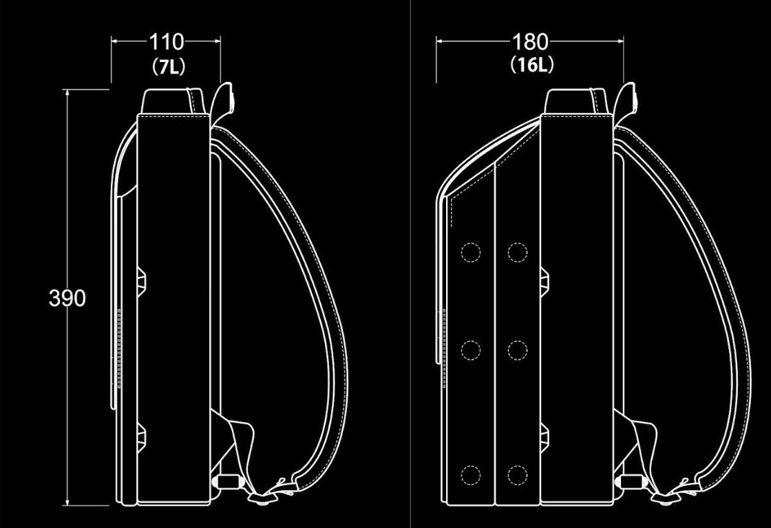 通常の拡張型バックパックと異なり、マグネット式で段階的に必要な分だけ拡張していくため、無駄にだぶついた印象を与えることもありません。