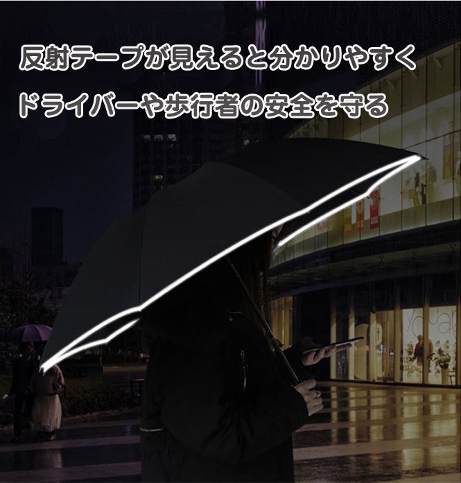 雨で薄暗く視界が悪い日や、学校帰りなど夜間の使用に備えて、反射テープ付きの折りたたみ傘があると便利です。360°反射テープが車のライトに反射してしっかり光ってくれるので、ドライバーから認識されやすくなります。