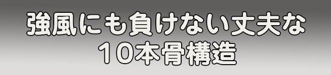 アルミ合金+グラスファイバーの強靭な骨を10本配置、強度はとても高く、豪雨、強風にも対応できます。