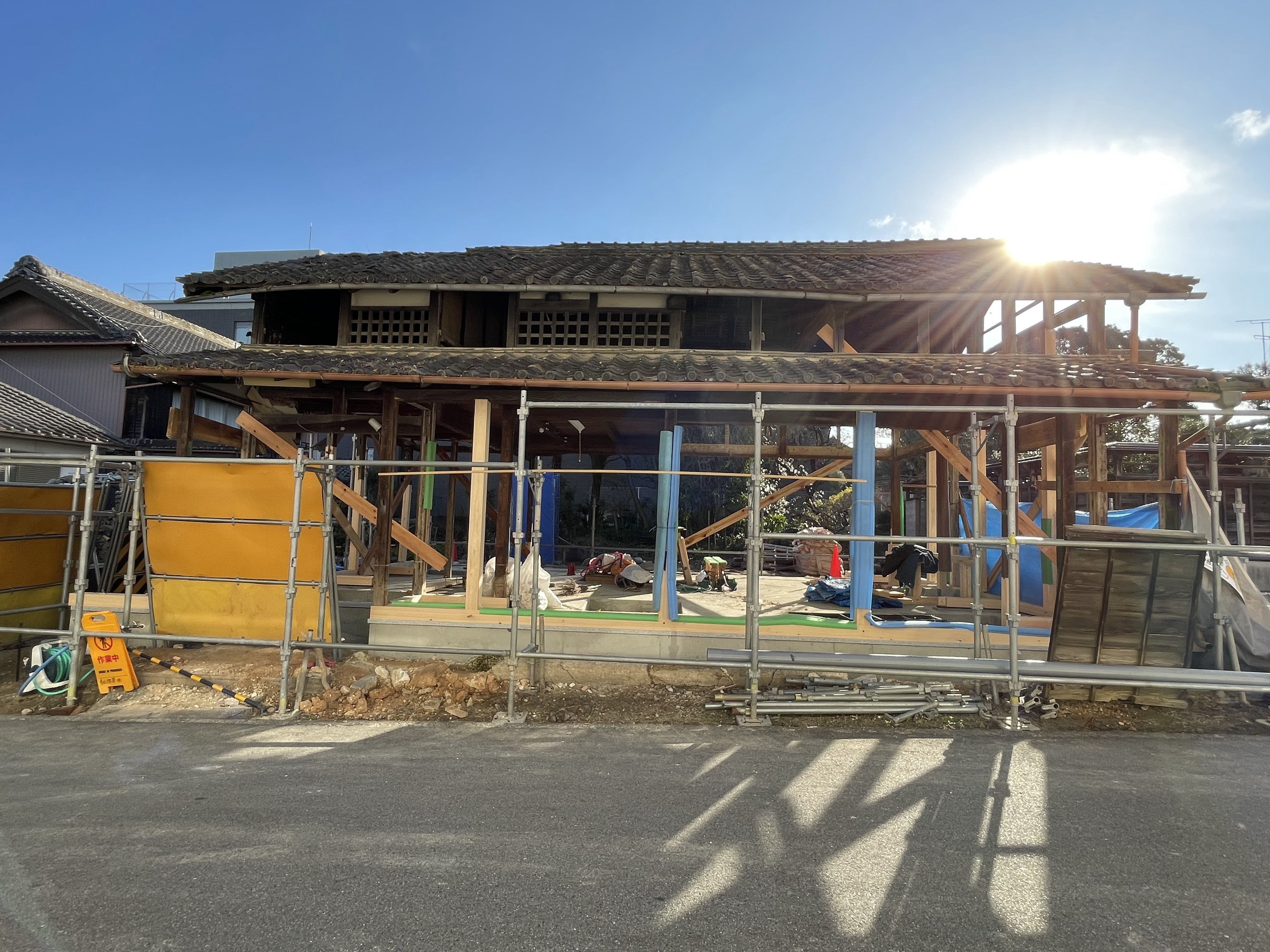 昨年10月に工事が着工し、11月には床下部分の基礎工事をするために、建物全体をジャッキアップする曳家さんにも入っていただきました。そして12月には屋根工事が始まり、年明けからは瓦を設置する工事が進行しています。