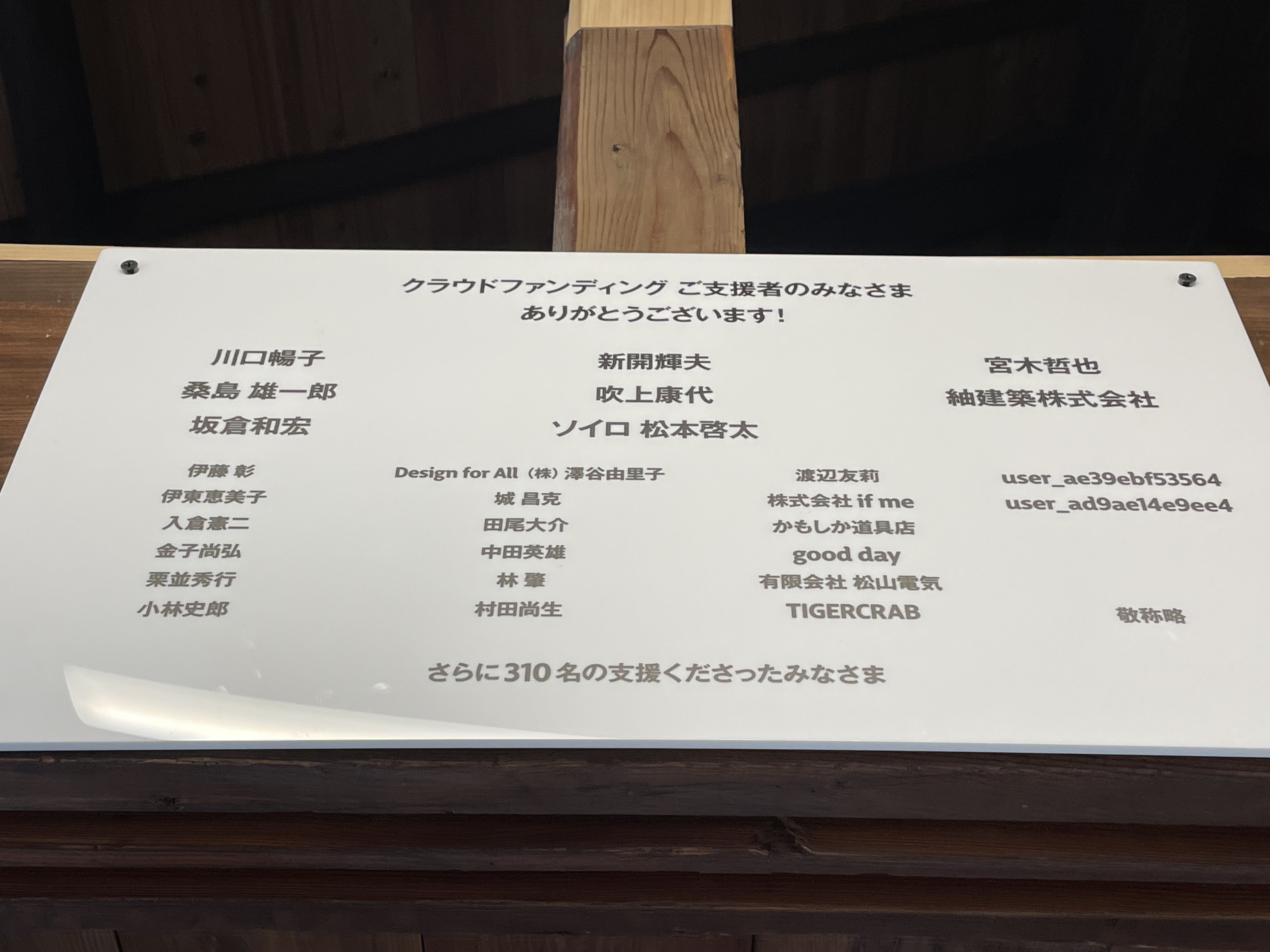 この間、おかげさまでいろんな方々にご利用いただいており、毎週、飲食店を営業してくださる方もでてきました。そして、ご報告が遅くなりましたが、クラファンにご支援いただいた方々のお名前を載せた名板の設置も完了しました。
