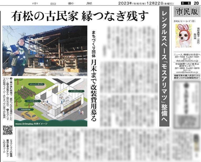 こんにちは、ありまつ中心家守会社の浅野です。本日、12月22日[金]に発行された中日新聞朝刊 名古屋市内版に弊社の取り組みが紹介されています。紙面ではまちづくり団体と記載がありますが、私たちは「合同会社」の民間事業者ですのでお間違い無いようにお願い致します。遊休資産の利活用、地域のにぎわいづくり、ブランディング等の営利活動を通じて、有松という地域に貢献できるように努力している最中です。さて、兼ねてから検討を知ていました、リターンのひとつである手ぬぐいのデザインが確定いたしました。キービジュアルとしてmoss Arimatsuのこうなったいいなという姿を、漫画家・イラストレーターの奥村ちひさんに描いていただきました。にぎやかでポップな空気感が生まれることを期待しています〜!