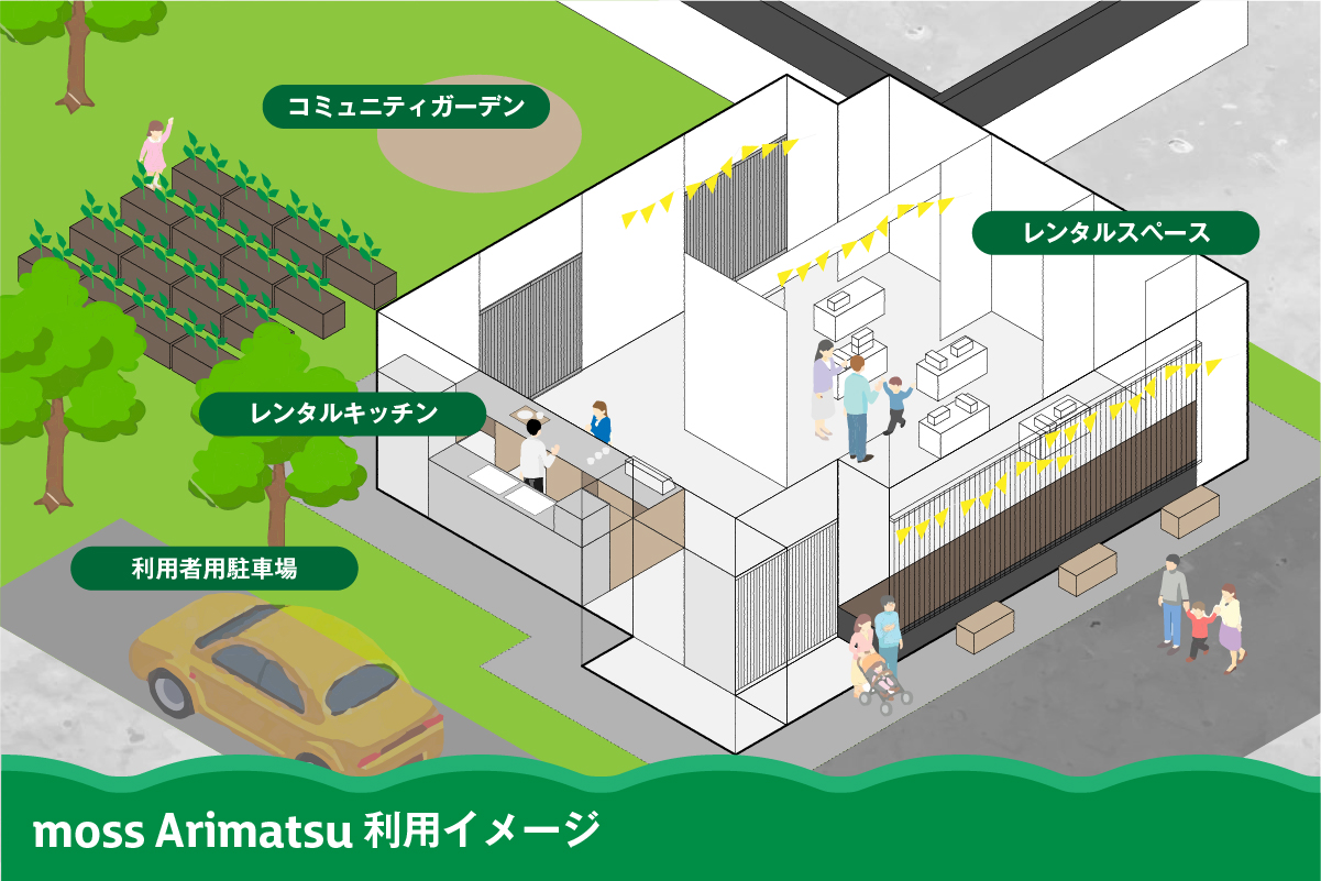 今回、新型コロナウイルスの5類移行を踏まえ、ようやく遊休不動産の活用を通じたにぎわいづくり事業として、古民家でのレンタルキッチン・レンタルスペース「moss Arimatsu(モス アリマツ)」の運営を予定しています。