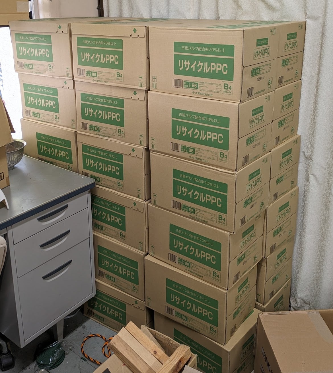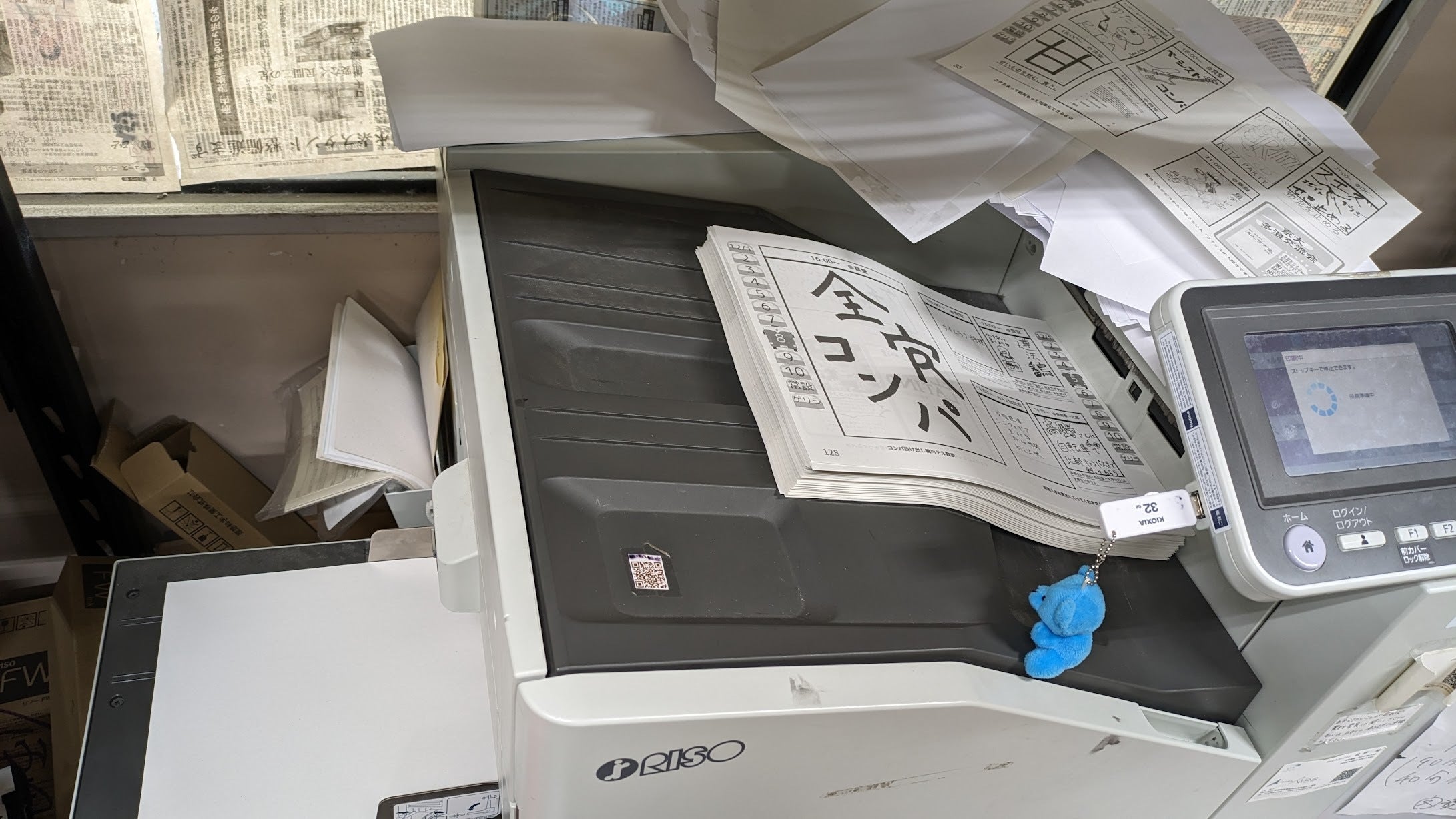山積みのダンボールに入った紙が、着々とパンフに変わっていっています!