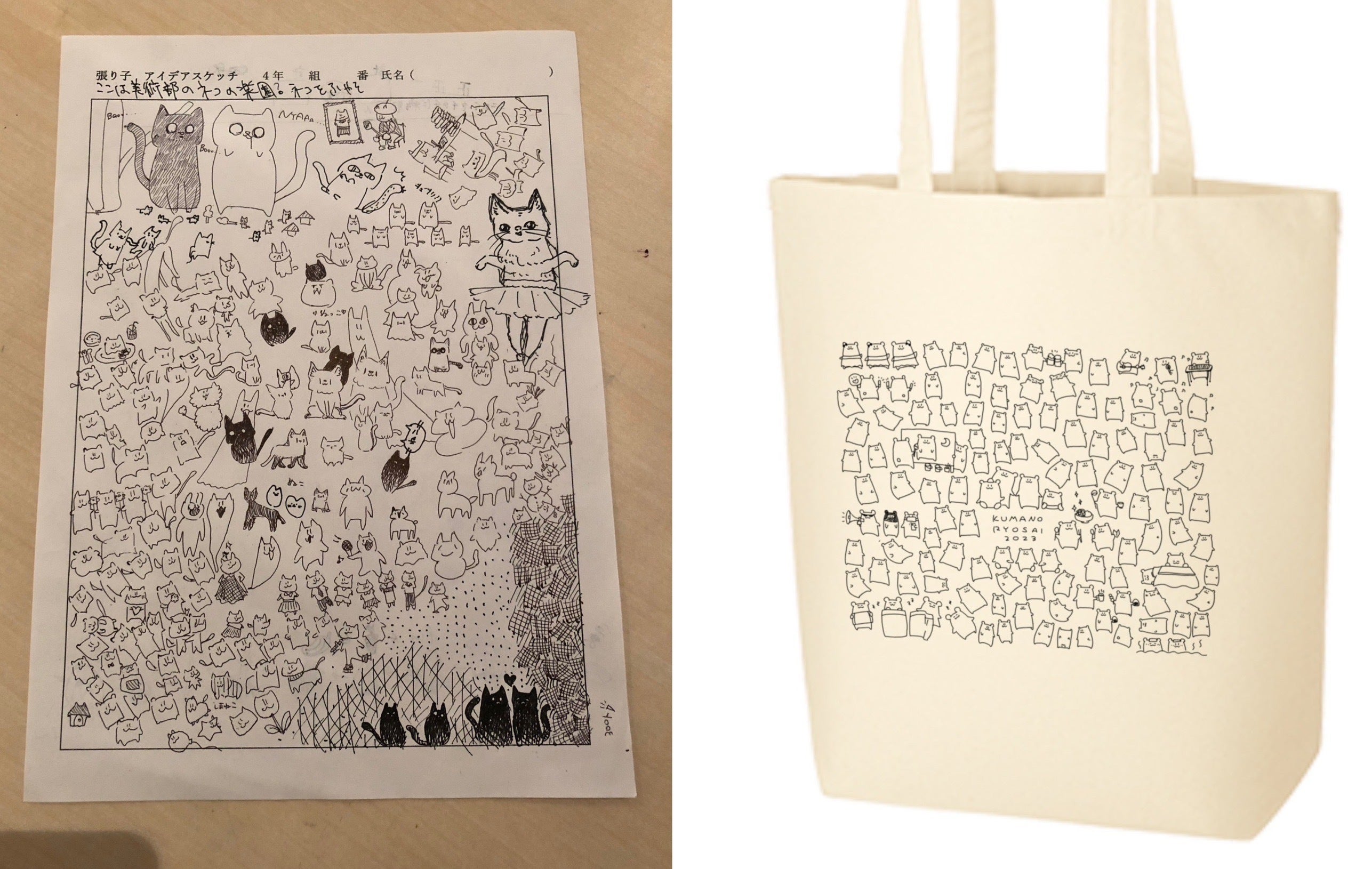トートバッグのデザインは、高校の美術部でやった文化祭の展覧会の受付の暇つぶしで、部員で紙を猫の絵で埋め尽くしたものがモデルになっています。いつかこんな細かい絵柄のものを作りたいと思っていたので、考えるのがすごく楽しかったです。