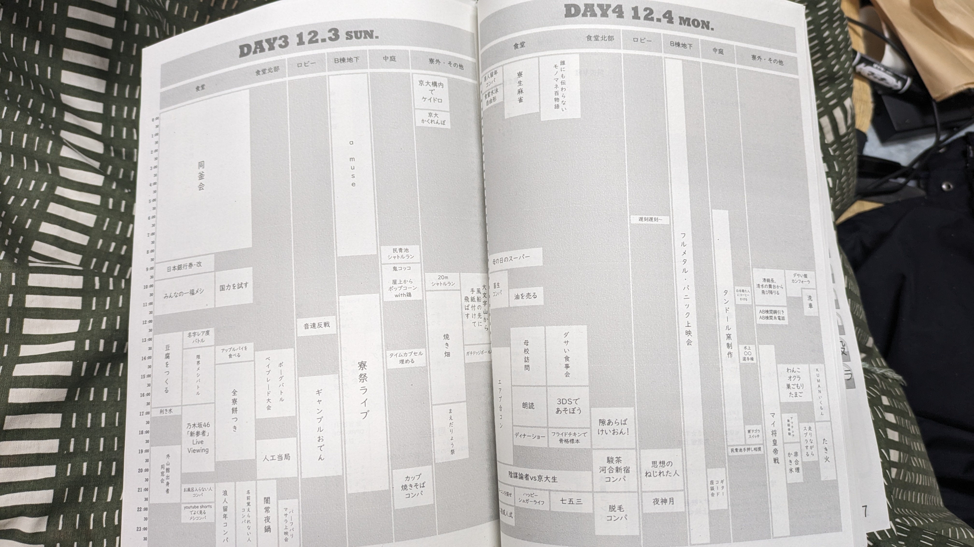 400以上の企画から130人ほどの企画者それぞれの都合や開催場所の問題、企画同士の相性を考えながらタイムテーブルを作る作業は本当に大変そうでした...企画責お疲れ様。また、今年は例年よりもタイムテーブルのページ数を大幅に増やし、デザインにもこだわったのでかなり見やすくなっています。
