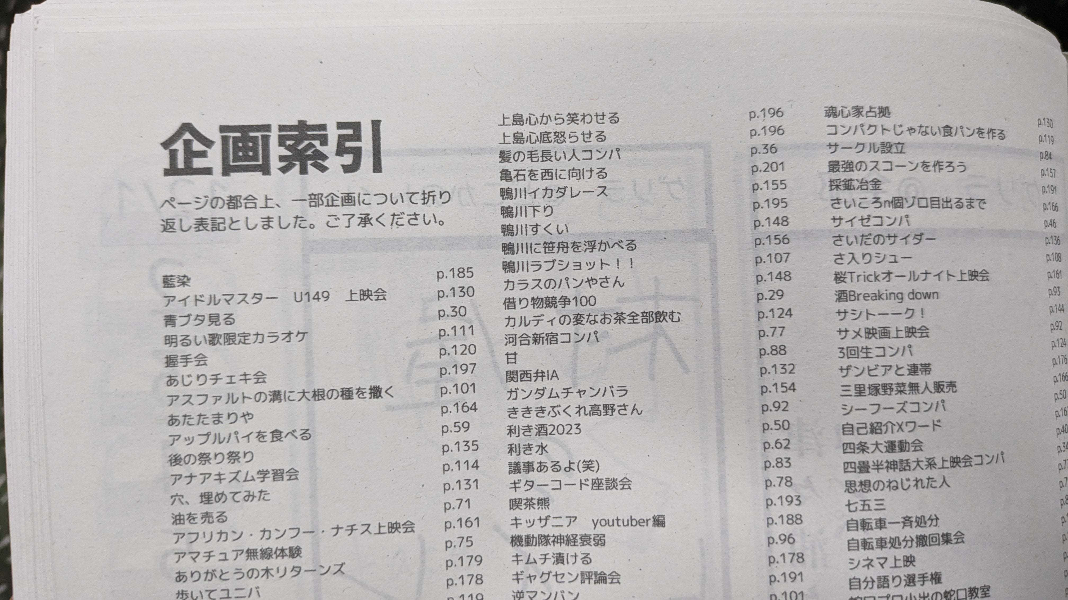 「その他」といった雑なくくりになっていますが、正直パンフ編集の中でもこれを何人かでやっている時が一番盛り上がりました。寮祭パンフでおそらく初めての試みである企画索引のページは全ての企画が1つの見開きに集まっていて、圧巻です。他にも、企画索引と企画選びフローチャート、フッターネタを全て徹夜のままの勢いで作りきったのはいい思い出です。