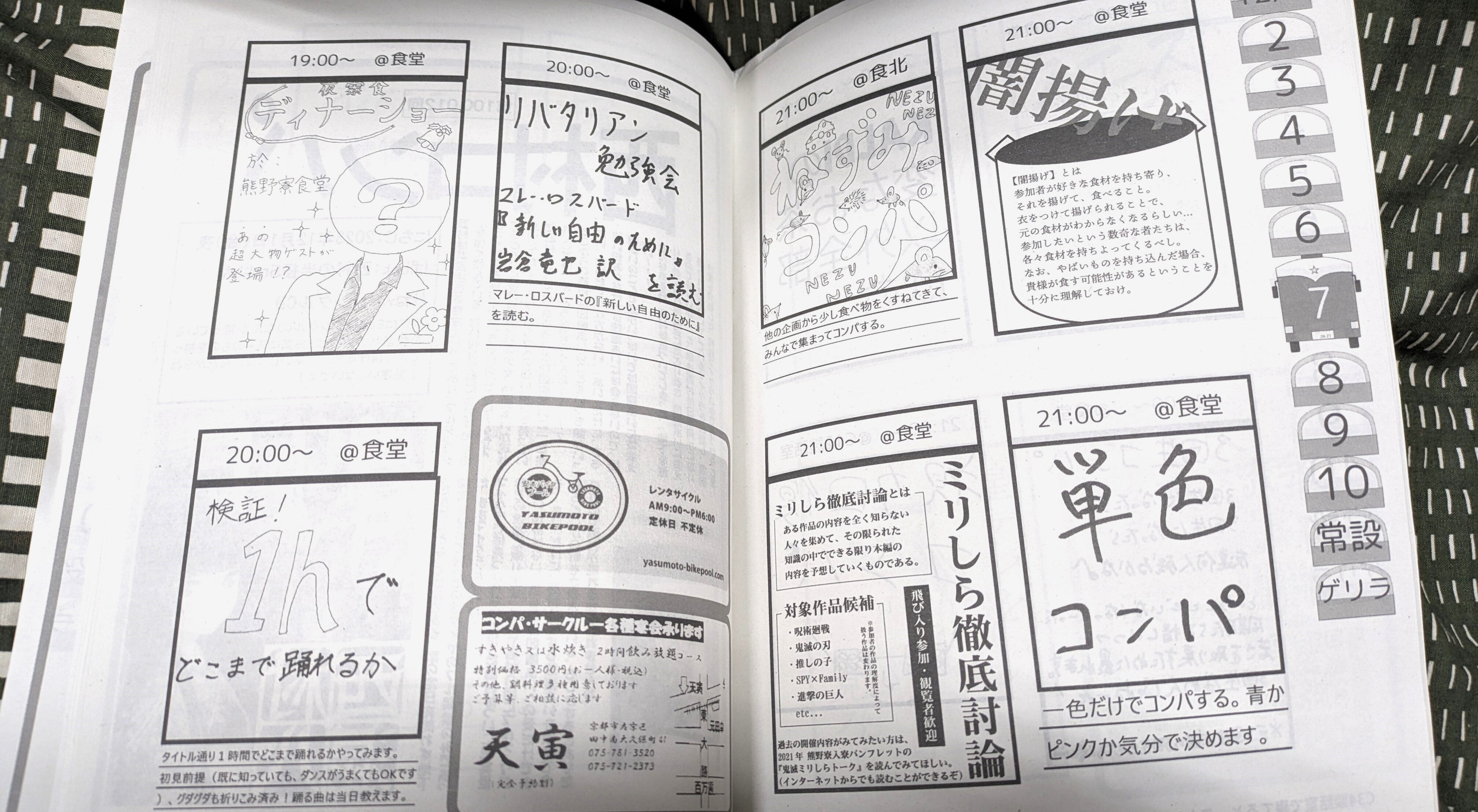 ここまで色々と書いてきましたが、パンフの意味はただ企画を紹介できることだけだとは思っていません。最近80年代から今までの寮祭パンフを見る機会があったんですが、それぞれの年の熊野寮祭というものを、当時の空気感を残しつつ後の世代に残せるのはパンフの強みだなと思いました。将来の熊野寮生が今年のパンフを気に入ってくれたらきっと制作に関わった寮祭実のみんなが喜ぶでしょう。また、寮祭パンフを読んだ高校生や浪人生が将来熊野寮に入寮してくれたら激アツですね。