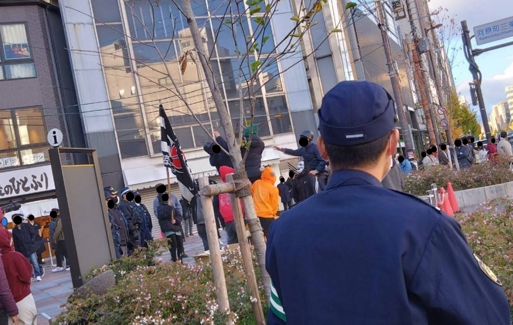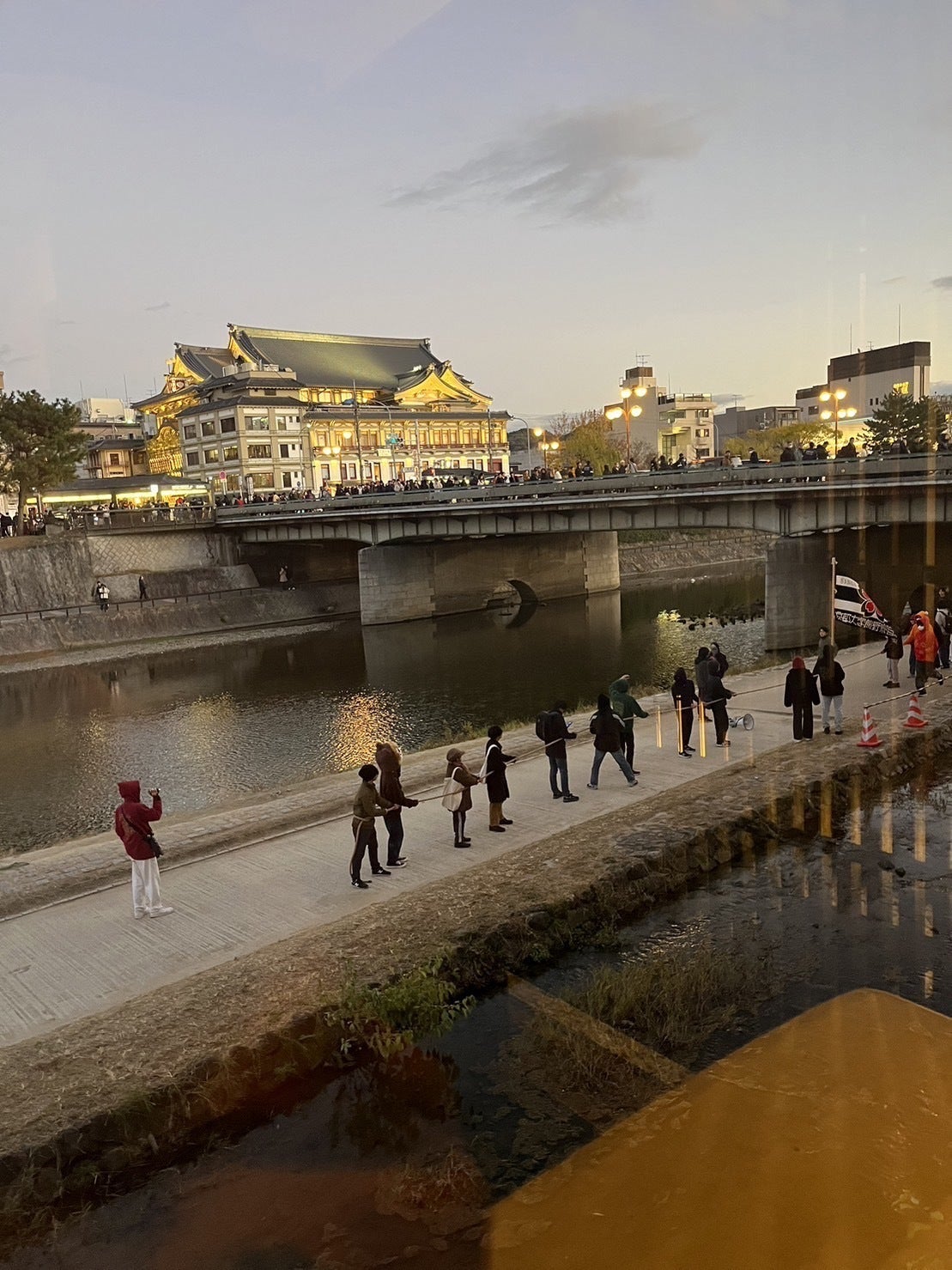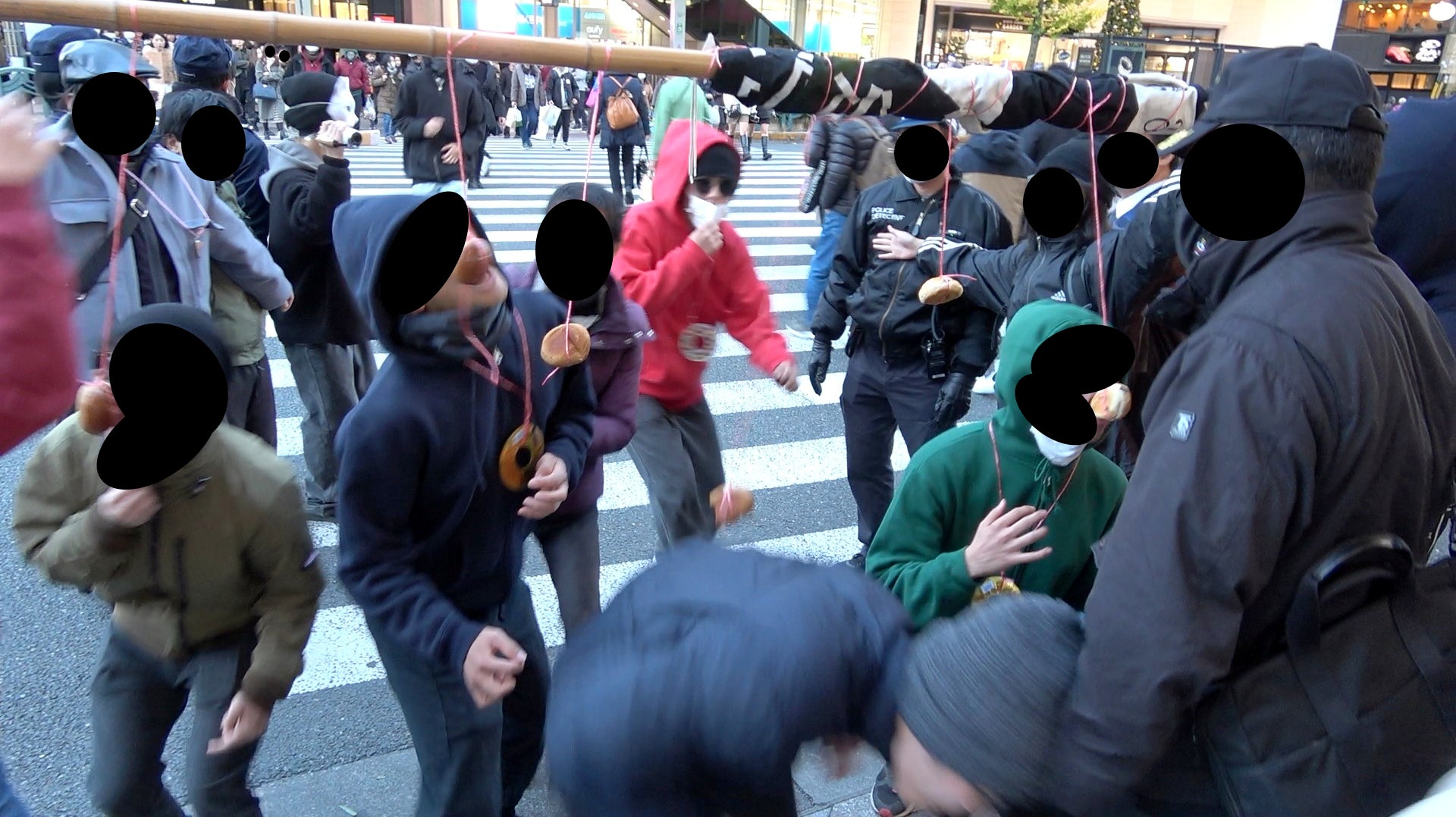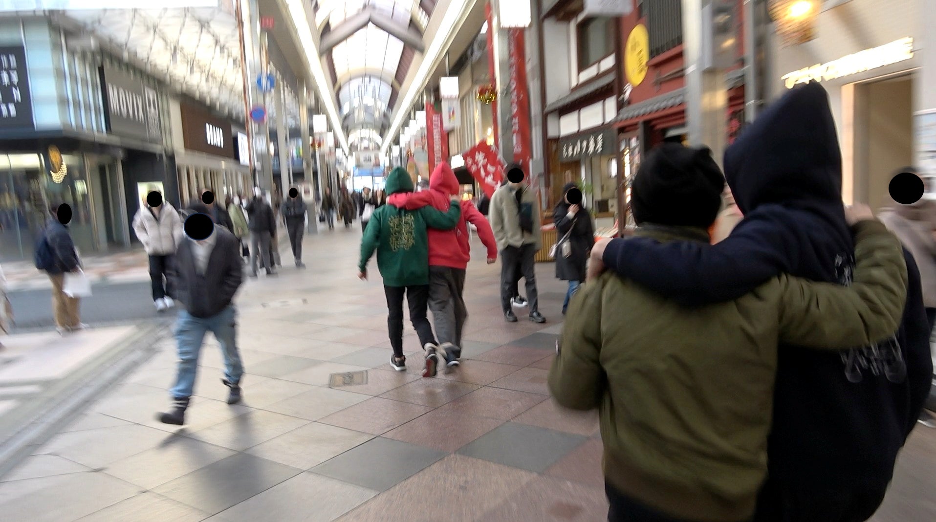 次は新京極通りにて二人三脚を行いました。ゴールは四条の交差点!安全に気を付けつつデットヒートを繰り広げました。中の人は足を結ぶヒモが開始30秒で切れてしまいました。