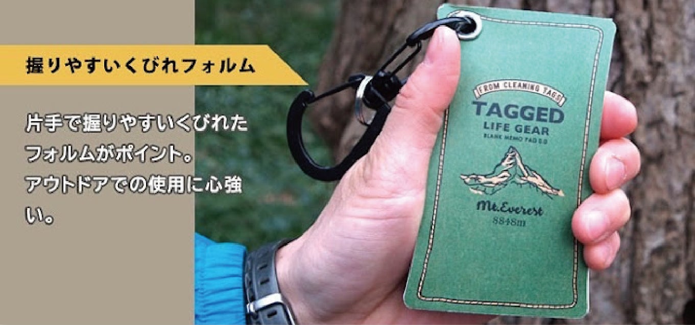 今回、クラウドファンディングするTAGEED LIFE GEARは、さらにTAGGED MEMO PADを進化させよりアウトドアで使いやすくする為にリング穴を開けたアイテムです。このことによりメモ帳をいちいちカバンの中からの出し入れをすることなく、フックやカバンにぶら下げられるようになりアクティブに使うことができます。