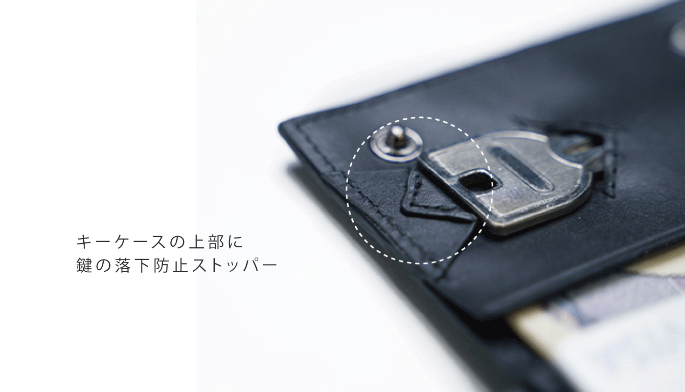 キーケース上部に 鍵の落下防止ストッパーをつけ、鍵の飛び出しを防止しました。