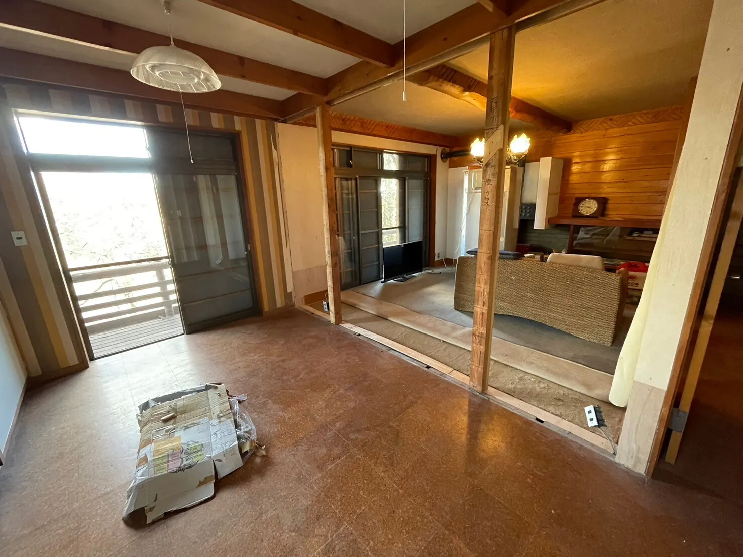 趣のある梁や光が多く差し込む窓は残しつつ、経年劣化の目立つ壁の補修と床のフローリング張り替えを行います。