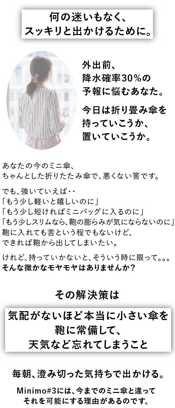 最近は、天気予報も当てにならない時代になりました。そんな中でも、あなたがフットワーク軽く、何の不安もなく外出していただくために、このMinimo#3はつくられました。